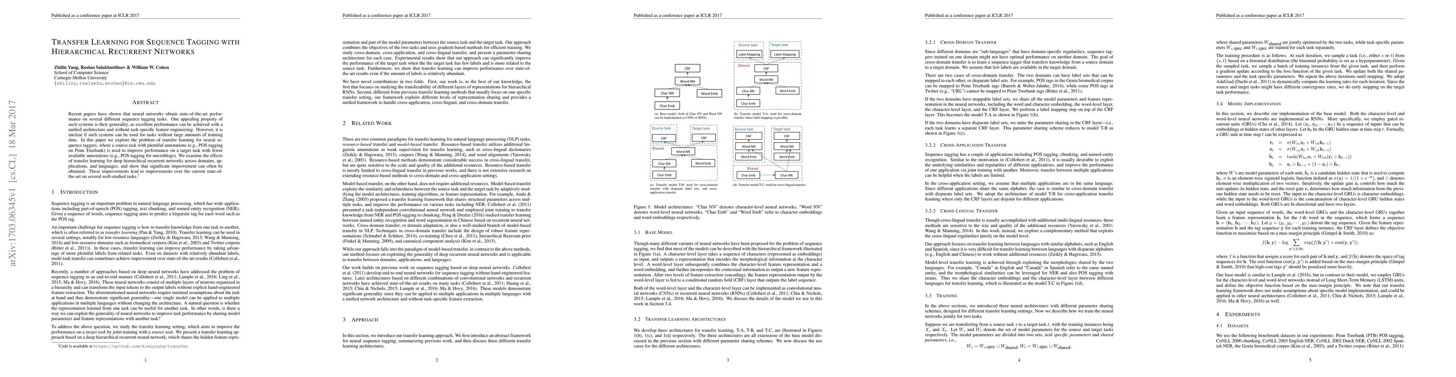 This paper explores transfer learning for neural sequence taggers using hierarchical recurrent networks, demonstrating significant performance improvements on target tasks with limited data by leveraging a source task with abundant annotations. The study shows state-of-the-art results across various domains, applications, and languages.