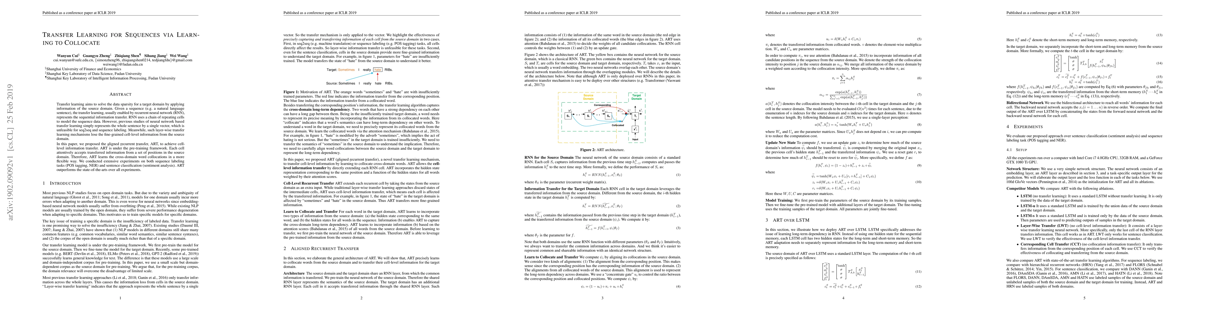 This paper introduces ART, an aligned recurrent transfer method for sequence data, which enables fine-grained cell-level information transfer in transfer learning. ART outperforms existing methods in sequence labeling and sentence classification tasks by leveraging cross-domain word collocations.