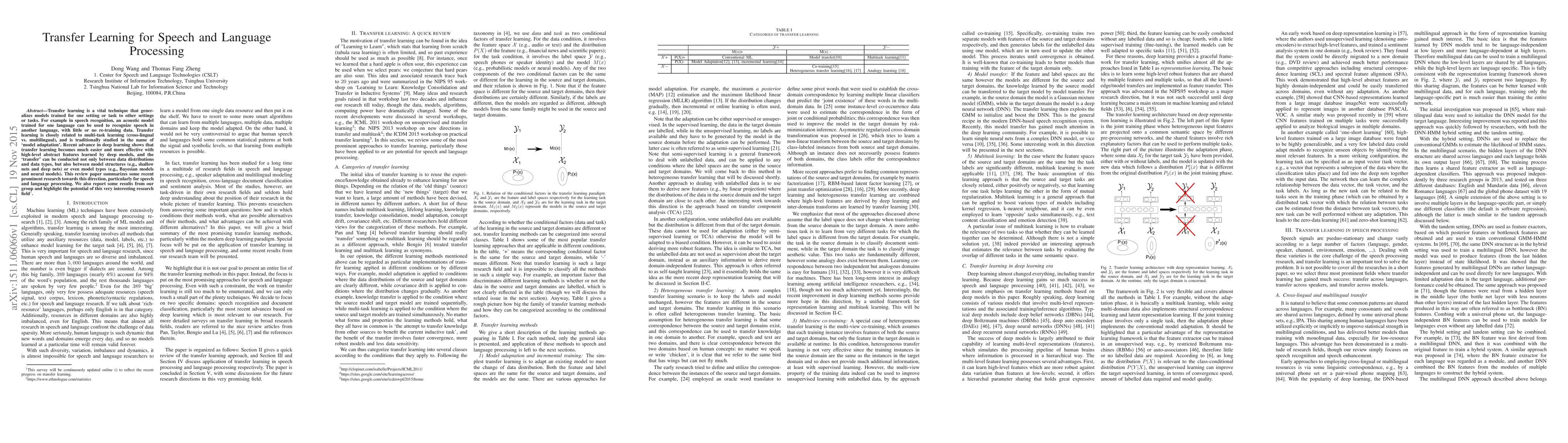 This paper reviews recent advancements in transfer learning for speech and language processing, highlighting how models trained in one setting can be adapted to others with minimal re-training. It emphasizes the effectiveness of deep learning in facilitating transfer learning across different data distributions, model structures, and types.