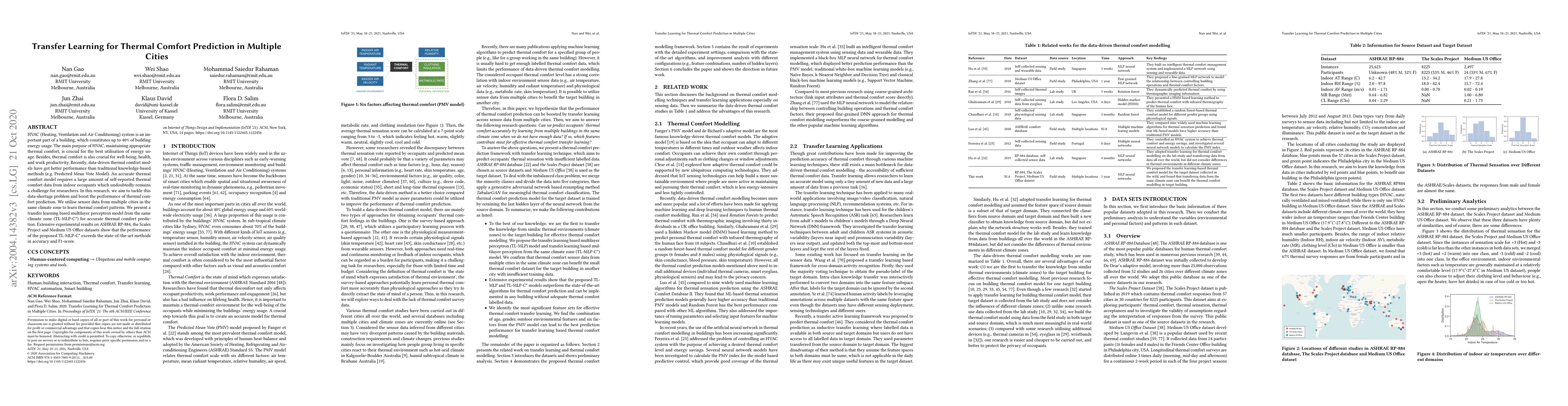This paper proposes a transfer learning-based multilayer perceptron model (TL-MLP-C*) for predicting thermal comfort in buildings using sensor data from multiple cities within the same climate zone. The model outperforms existing methods in accuracy, precision, and F1-score, addressing the challenge of data scarcity for thermal comfort prediction.