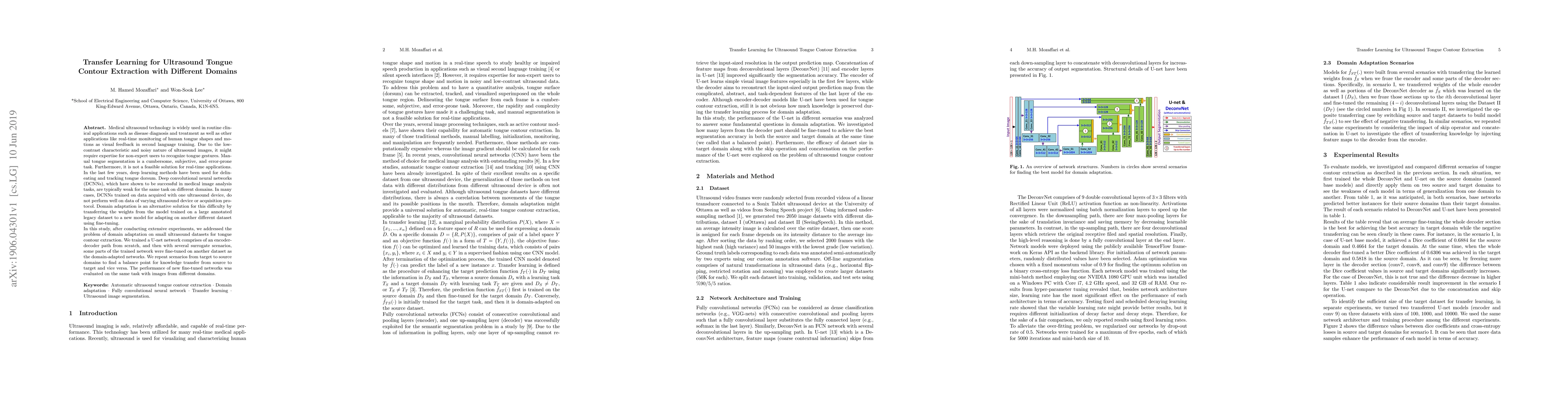 Medical ultrasound technology is widely used in routine clinical applications such as disease diagnosis and treatment as well as other applications like real-time monitoring of human tongue shapes and motions as visual feedback in second language training. Due to the low-contrast characteristic and noisy nature of ultrasound images, it might require expertise for non-expert users to recognize tongue gestures. Manual tongue segmentation is a cumbersome, subjective, and error-prone task. Furthermore, it is not a feasible solution for real-time applications. In the last few years, deep learning methods have been used for delineating and tracking tongue dorsum. Deep convolutional neural networks (DCNNs), which have shown to be successful in medical image analysis tasks, are typically weak for the same task on different domains. In many cases, DCNNs trained on data acquired with one ultrasound device, do not perform well on data of varying ultrasound device or acquisition protocol. Domain adaptation is an alternative solution for this difficulty by transferring the weights from the model trained on a large annotated legacy dataset to a new model for adapting on another different dataset using fine-tuning. In this study, after conducting extensive experiments, we addressed the problem of domain adaptation on small ultrasound datasets for tongue contour extraction. We trained a U-net network comprises of an encoder-decoder path from scratch, and then with several surrogate scenarios, some parts of the trained network were fine-tuned on another dataset as the domain-adapted networks. We repeat scenarios from target to source domains to find a balance point for knowledge transfer from source to target and vice versa. The performance of new fine-tuned networks was evaluated on the same task with images from different domains.