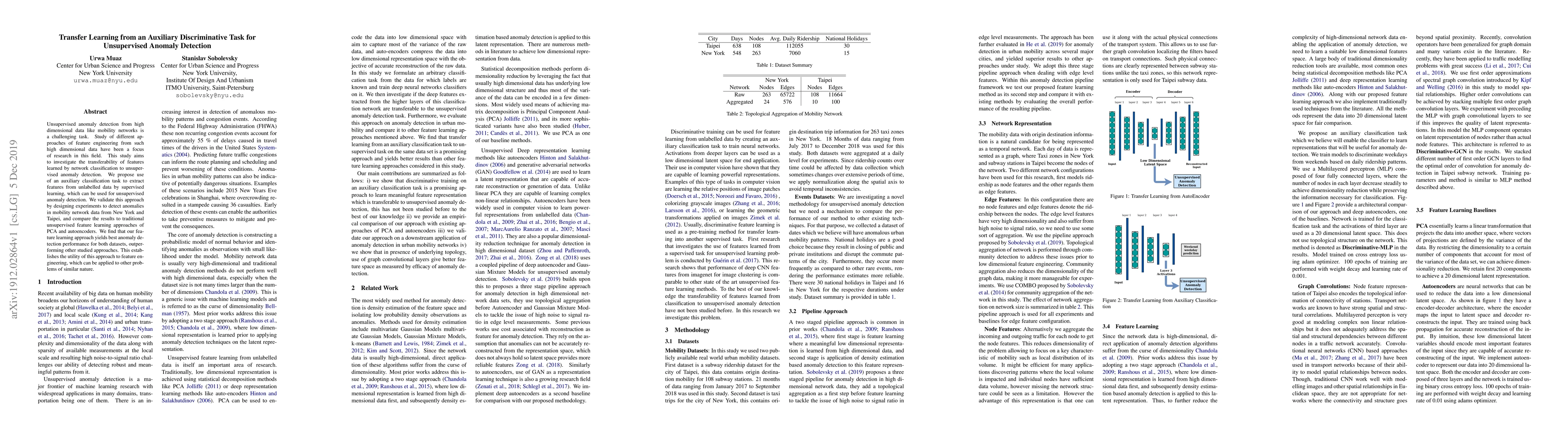 This paper proposes using an auxiliary discriminative task for feature extraction in unsupervised anomaly detection, demonstrating superior performance over traditional methods like PCA and autoencoders in detecting anomalies in mobility network data from New York and Taipei. The study highlights the effectiveness of transfer learning for feature engineering in high-dimensional data.