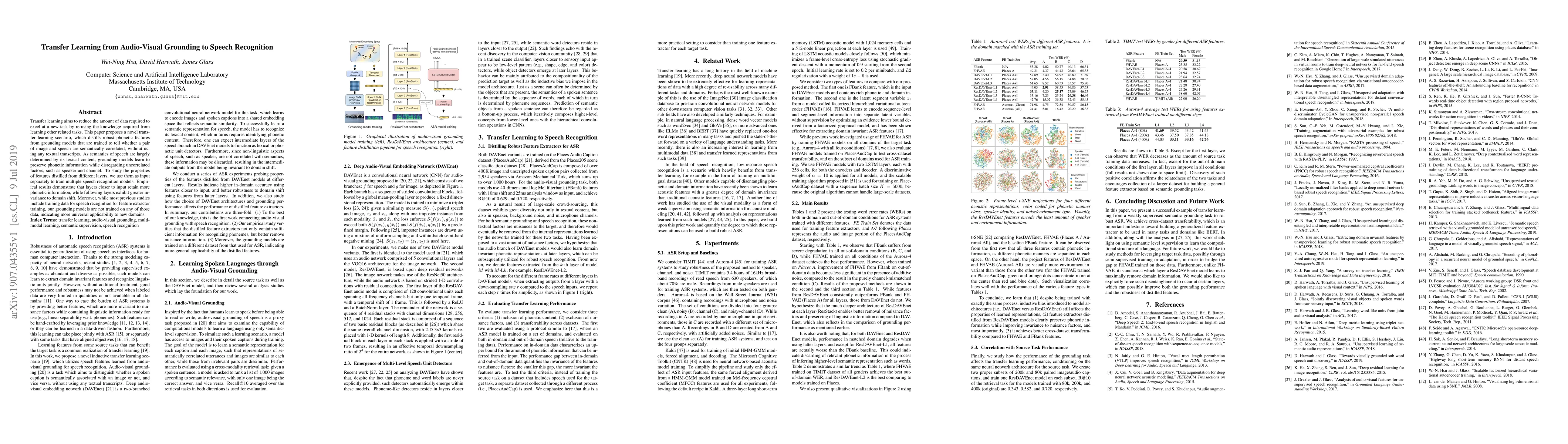 This paper explores transfer learning from audio-visual grounding to enhance speech recognition, distilling phonetic features from models trained on image-speech pairs without textual transcripts. Results show that deeper layers offer greater domain shift invariance, while shallower layers retain more phonetic information, demonstrating the method's universal applicability.