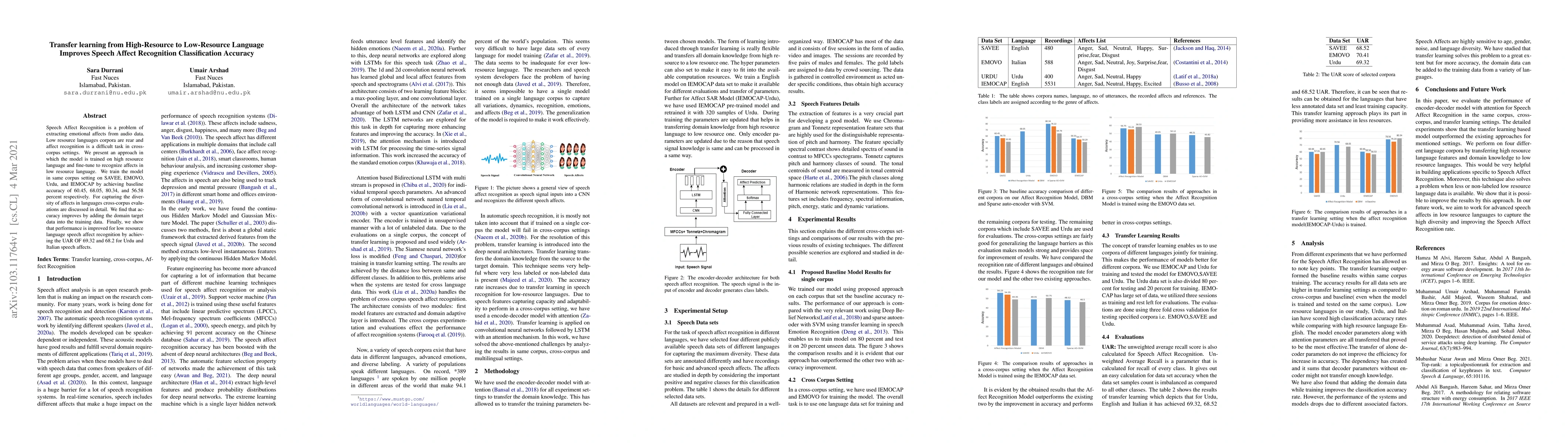 Speech Affect Recognition is a problem of extracting emotional affects from audio data. Low resource languages corpora are rear and affect recognition is a difficult task in cross-corpus settings. We present an approach in which the model is trained on high resource language and fine-tune to recognize affects in low resource language. We train the model in same corpus setting on SAVEE, EMOVO, Urdu, and IEMOCAP by achieving baseline accuracy of 60.45, 68.05, 80.34, and 56.58 percent respectively. For capturing the diversity of affects in languages cross-corpus evaluations are discussed in detail. We find that accuracy improves by adding the domain target data into the training data. Finally, we show that performance is improved for low resource language speech affect recognition by achieving the UAR OF 69.32 and 68.2 for Urdu and Italian speech affects.