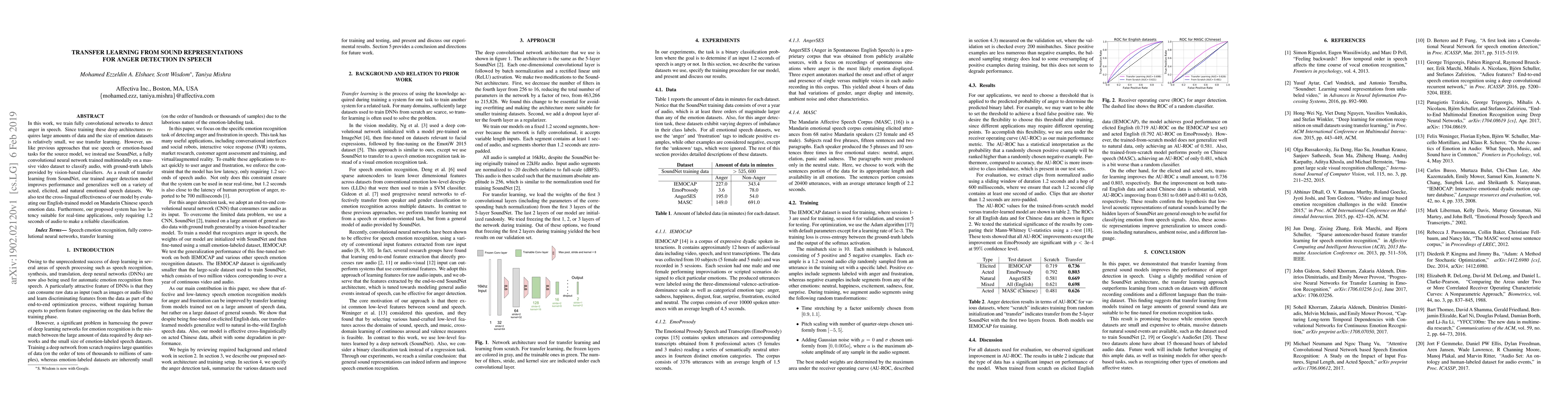 A new anger detection system uses transfer learning from a pre-trained SoundNet model to improve performance on speech emotion datasets. The system requires only 1.2 seconds of audio for classification.