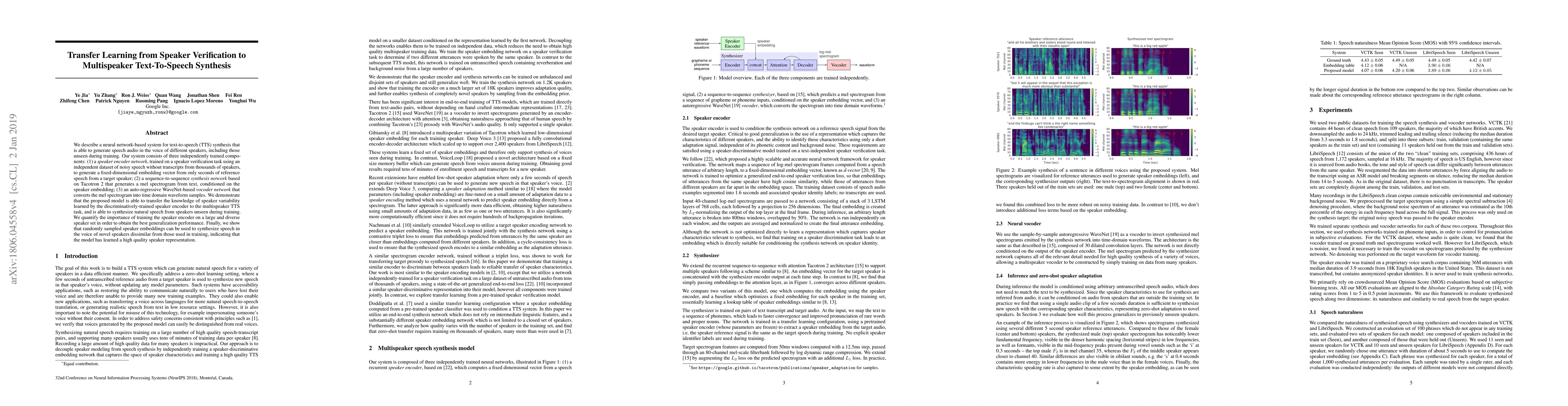 This paper presents a neural network system for multispeaker text-to-speech synthesis that leverages transfer learning from a speaker verification task. The system uses a speaker encoder, Tacotron 2 synthesis network, and WaveNet vocoder to generate natural speech from unseen speakers, demonstrating high-quality speaker representation.