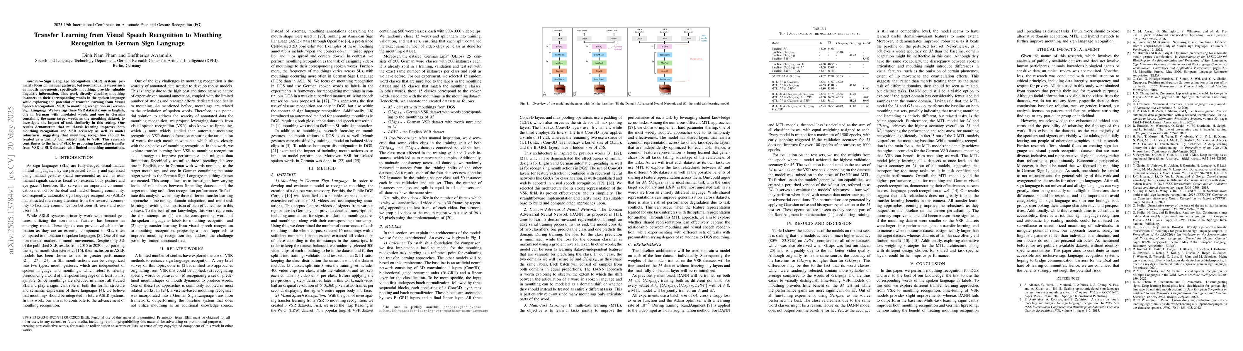 Researchers explored using transfer learning from Visual Speech Recognition to improve mouthing recognition in German Sign Language, finding that multi-task learning improves accuracy and model robustness.