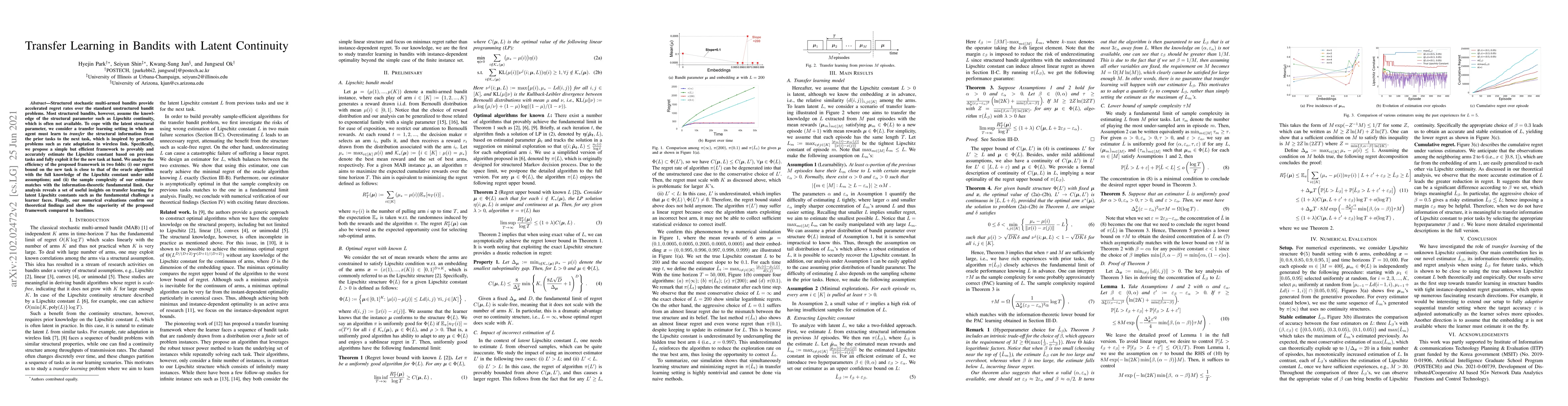 Structured stochastic multi-armed bandits provide accelerated regret rates over the standard unstructured bandit problems. Most structured bandits, however, assume the knowledge of the structural parameter such as Lipschitz continuity, which is often not available. To cope with the latent structural parameter, we consider a transfer learning setting in which an agent must learn to transfer the structural information from the prior tasks to the next task, which is inspired by practical problems such as rate adaptation in wireless link. We propose a novel framework to provably and accurately estimate the Lipschitz constant based on previous tasks and fully exploit it for the new task at hand. We analyze the efficiency of the proposed framework in two folds: (i) the sample complexity of our estimator matches with the information-theoretic fundamental limit; and (ii) our regret bound on the new task is close to that of the oracle algorithm with the full knowledge of the Lipschitz constant under mild assumptions. Our analysis reveals a set of useful insights on transfer learning for latent Lipschitzconstants such as the fundamental challenge a learner faces. Our numerical evaluations confirm our theoretical findings and show the superiority of the proposed framework compared to baselines.