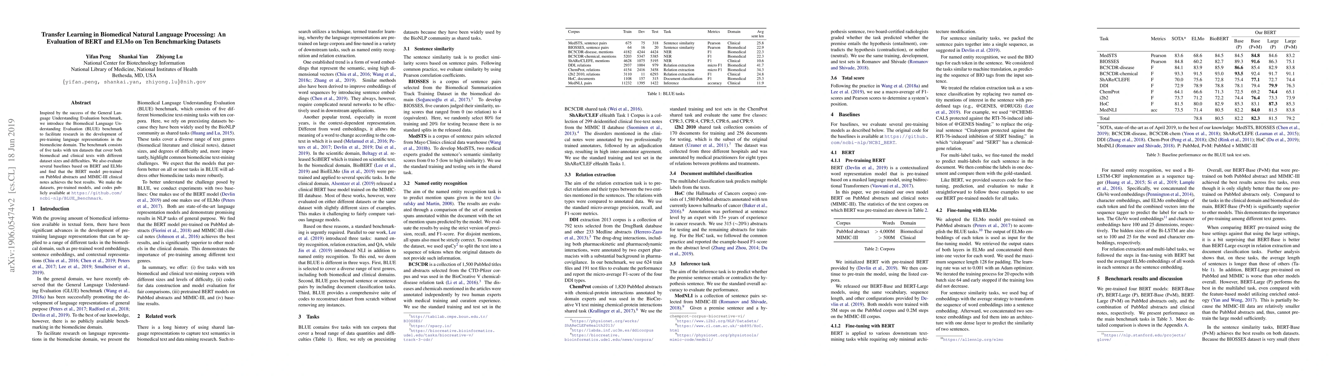 This paper introduces the Biomedical Language Understanding Evaluation (BLUE) benchmark with ten datasets for biomedicine text analysis, evaluating BERT and ELMo models. BERT pre-trained on PubMed and MIMIC-III shows superior performance across tasks, with datasets and resources available for public use.