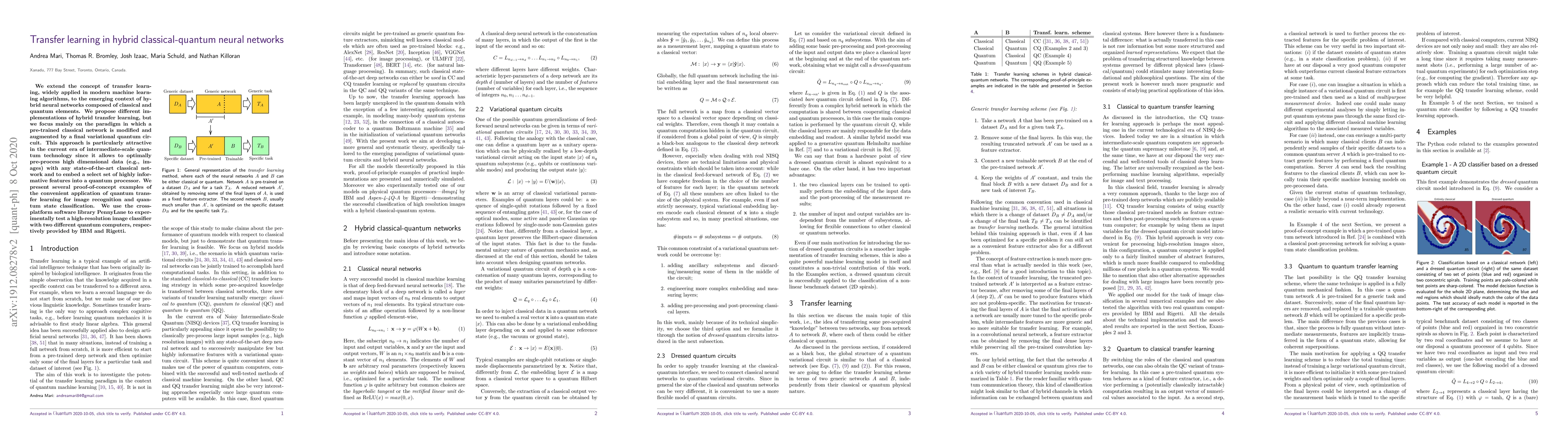 This paper explores transfer learning in hybrid classical-quantum neural networks, specifically focusing on augmenting pre-trained classical networks with variational quantum circuits for enhanced data processing. The study demonstrates practical applications for image recognition and quantum state classification using PennyLane on IBM and Rigetti quantum computers.