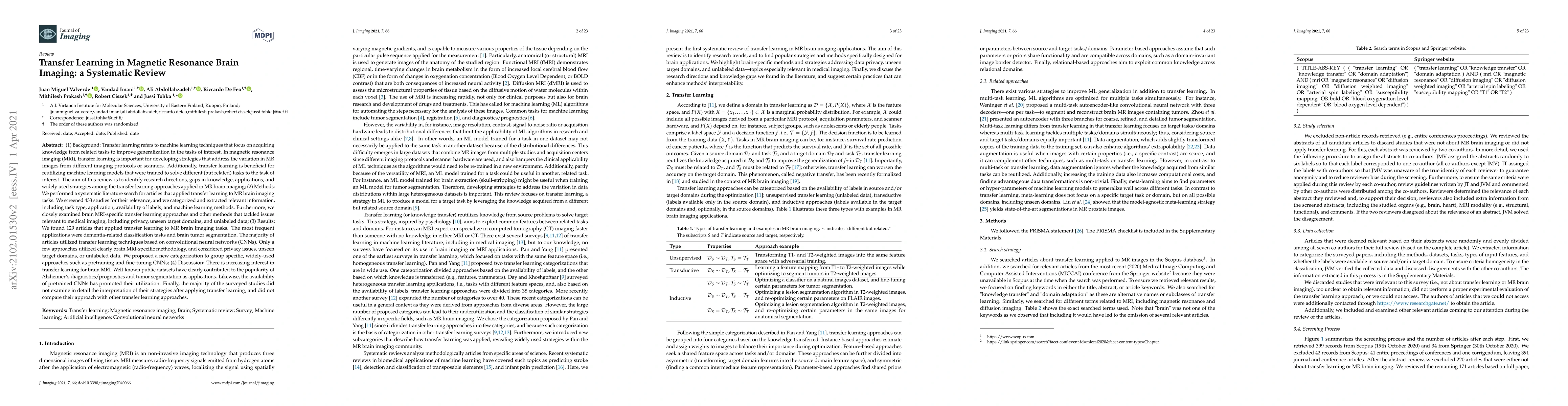Transfer learning refers to machine learning techniques that focus on acquiring knowledge from related tasks to improve generalization in the tasks of interest. In MRI, transfer learning is important for developing strategies that address the variation in MR images. Additionally, transfer learning is beneficial to re-utilize machine learning models that were trained to solve related tasks to the task of interest. Our goal is to identify research directions, gaps of knowledge, applications, and widely used strategies among the transfer learning approaches applied in MR brain imaging. We performed a systematic literature search for articles that applied transfer learning to MR brain imaging. We screened 433 studies and we categorized and extracted relevant information, including task type, application, and machine learning methods. Furthermore, we closely examined brain MRI-specific transfer learning approaches and other methods that tackled privacy, unseen target domains, and unlabeled data. We found 129 articles that applied transfer learning to brain MRI tasks. The most frequent applications were dementia related classification tasks and brain tumor segmentation. A majority of articles utilized transfer learning on convolutional neural networks (CNNs). Only few approaches were clearly brain MRI specific, considered privacy issues, unseen target domains or unlabeled data. We proposed a new categorization to group specific, widely-used approaches. There is an increasing interest in transfer learning within brain MRI. Public datasets have contributed to the popularity of Alzheimer's diagnostics/prognostics and tumor segmentation. Likewise, the availability of pretrained CNNs has promoted their utilization. Finally, the majority of the surveyed studies did not examine in detail the interpretation of their strategies after applying transfer learning, and did not compare to other approaches.