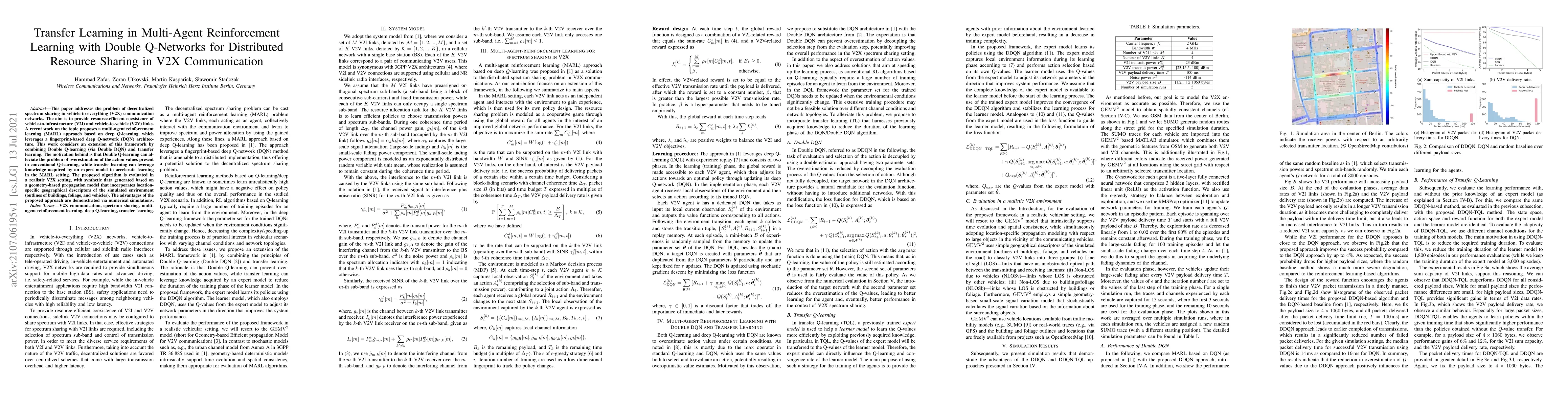 This paper proposes a multi-agent reinforcement learning framework combining Double Q-learning and transfer learning for efficient decentralized spectrum sharing in V2X communication networks. The approach aims to enhance resource coexistence between V2I and V2V links, leveraging realistic synthetic data for evaluation.