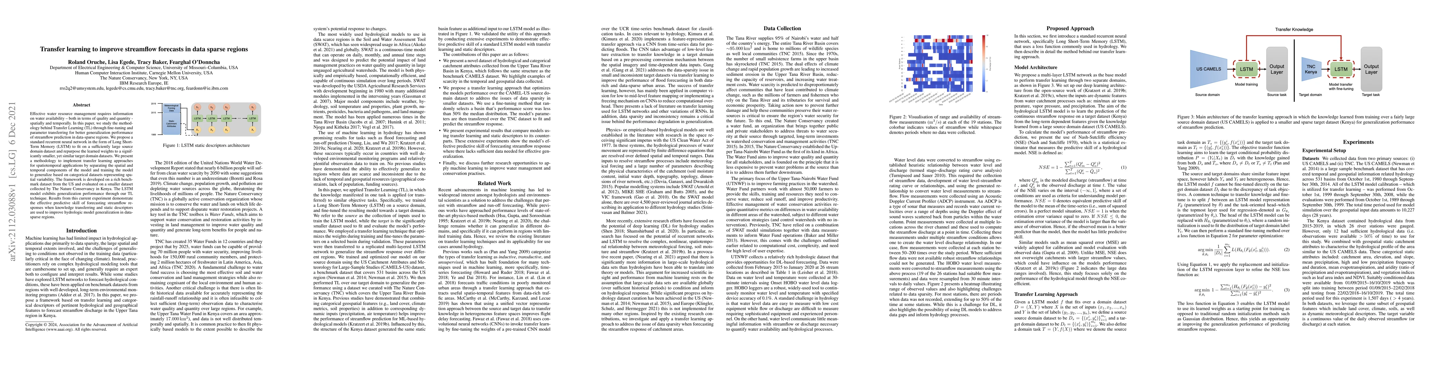 Effective water resource management requires information on water availability, both in terms of quality and quantity, spatially and temporally. In this paper, we study the methodology behind Transfer Learning (TL) through fine-tuning and parameter transferring for better generalization performance of streamflow prediction in data-sparse regions. We propose a standard recurrent neural network in the form of Long Short-Term Memory (LSTM) to fit on a sufficiently large source domain dataset and repurpose the learned weights to a significantly smaller, yet similar target domain datasets. We present a methodology to implement transfer learning approaches for spatiotemporal applications by separating the spatial and temporal components of the model and training the model to generalize based on categorical datasets representing spatial variability. The framework is developed on a rich benchmark dataset from the US and evaluated on a smaller dataset collected by The Nature Conservancy in Kenya. The LSTM model exhibits generalization performance through our TL technique. Results from this current experiment demonstrate the effective predictive skill of forecasting streamflow responses when knowledge transferring and static descriptors are used to improve hydrologic model generalization in data-sparse regions.