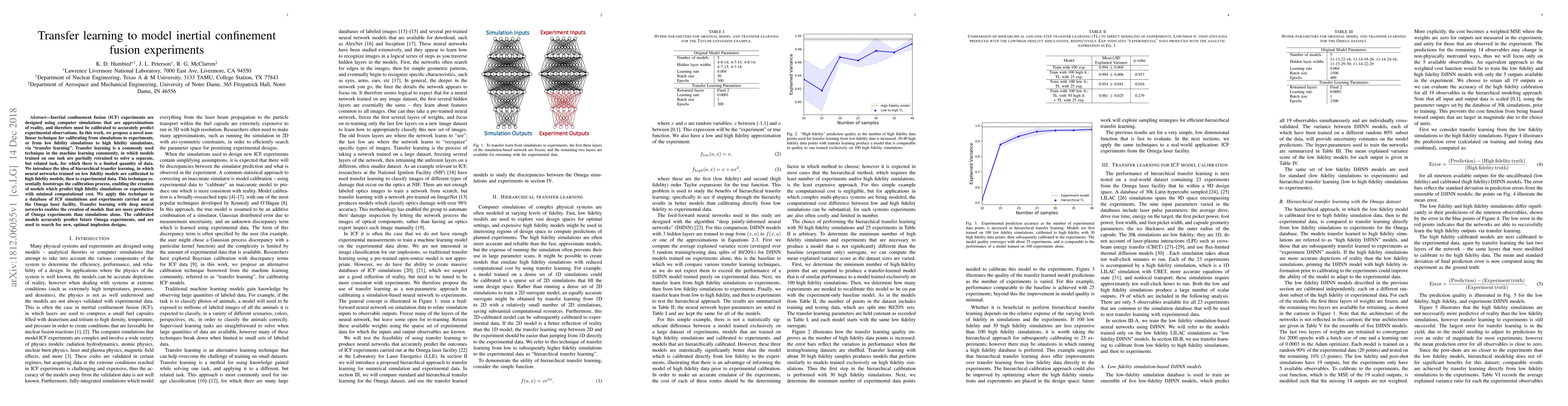 This paper proposes a transfer learning approach to calibrate inertial confinement fusion (ICF) simulations to experimental data, using hierarchical neural networks to improve predictive accuracy with minimal computational cost. The technique successfully predicts future experiments and aids in finding optimal implosion designs.