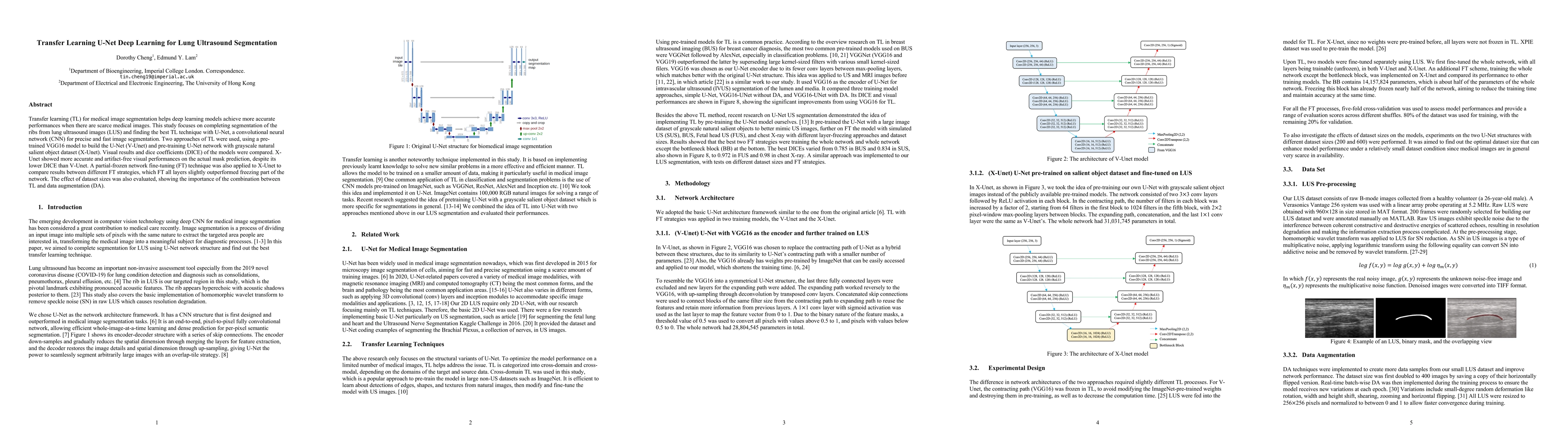 This study employs transfer learning with U-Net deep learning to segment ribs from lung ultrasound images, comparing pre-trained VGG16 model (V-Unet) and pre-trained grayscale natural salient object dataset (X-Unet). X-Unet achieved more accurate visual segmentation despite lower DICE scores, with partial-frozen fine-tuning slightly outperforming other strategies.