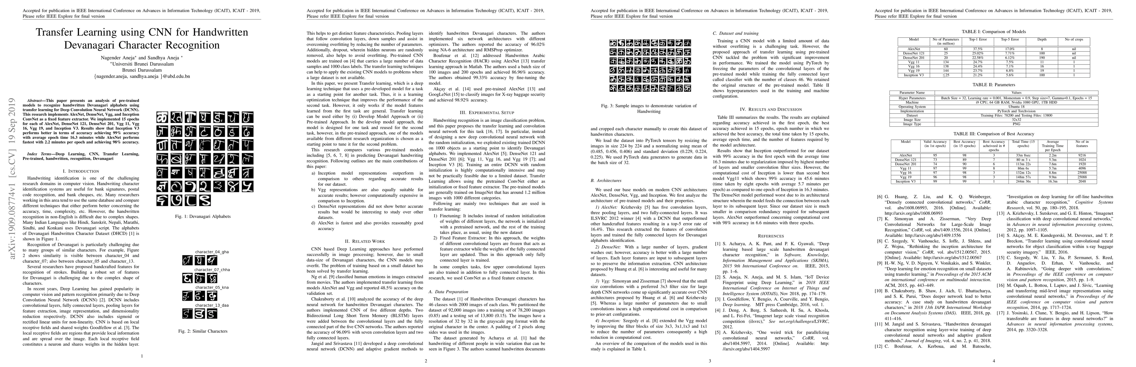 This paper explores the effectiveness of pre-trained CNN models for handwritten Devanagari character recognition using transfer learning, finding Inception V3 to achieve 99% accuracy with minimal epoch time, while AlexNet is the fastest but less accurate.