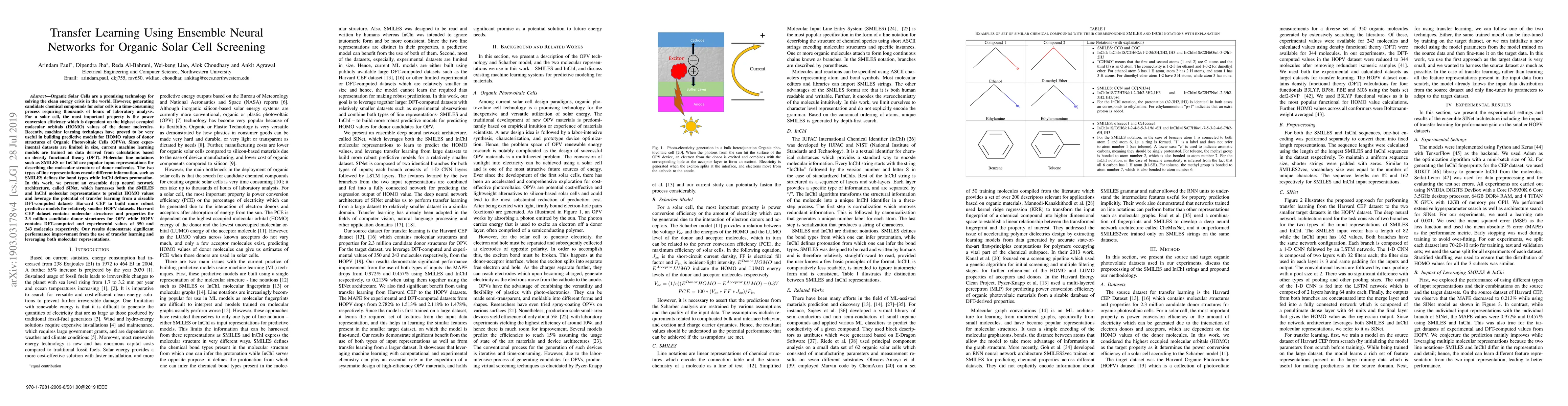 Researchers developed an ensemble neural network model called SINet to predict HOMO values in organic solar cells using both SMILES and InChI molecular representations, achieving significant performance improvements through transfer learning.