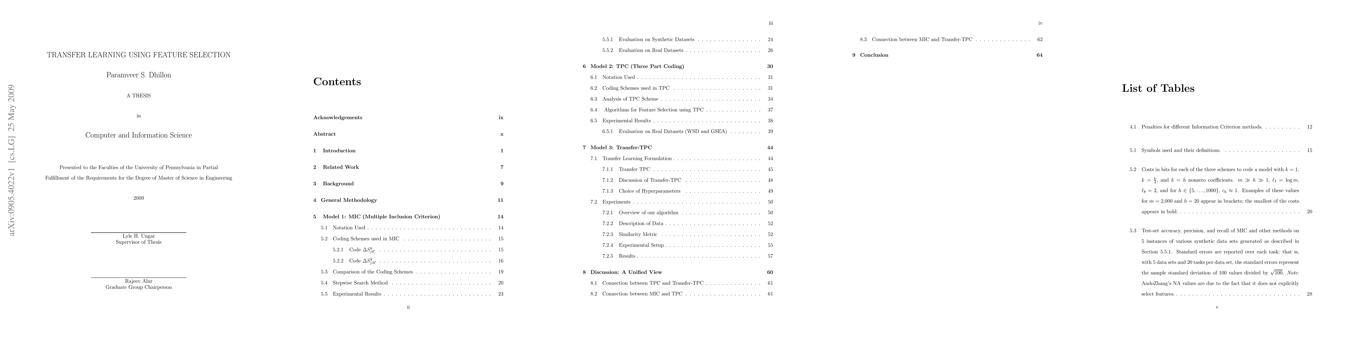 This research paper presents three methods for using transfer learning to improve feature selection in machine learning, with applications in genomic data and Word Sense Disambiguation, demonstrating improved results over existing approaches.