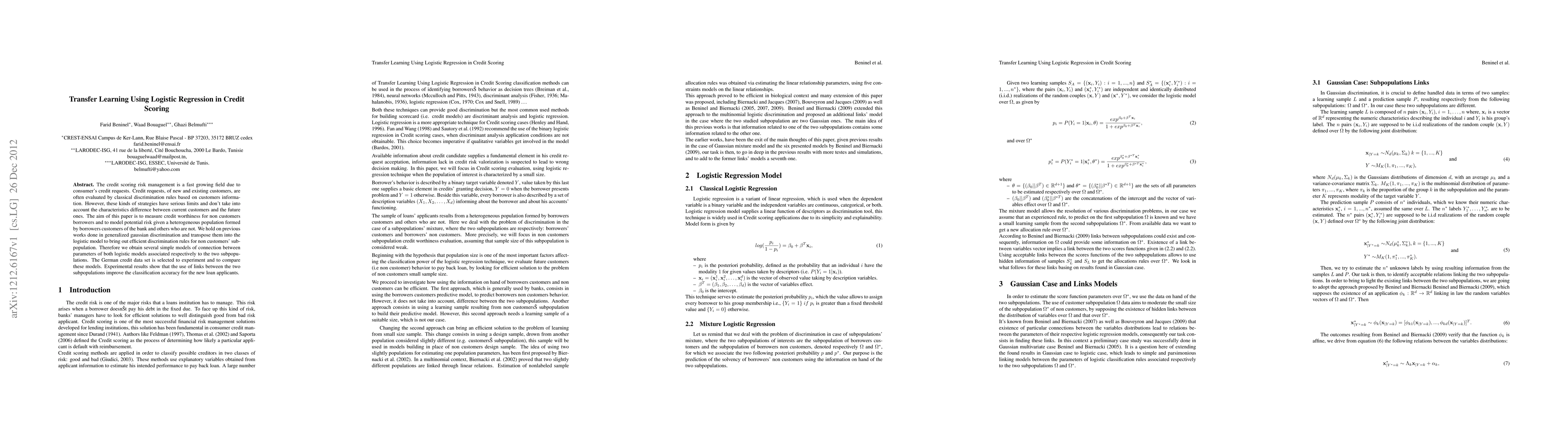This paper proposes using logistic regression for credit scoring, combining two subpopulations of borrowers with non-borrowers to improve classification accuracy for new loan applicants.