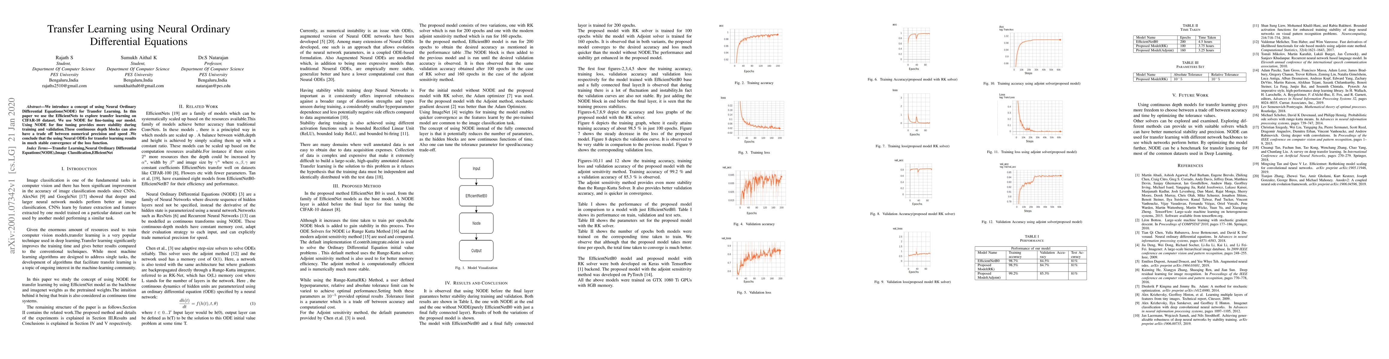 This paper explores the use of Neural Ordinary Differential Equations (NODE) for transfer learning, employing EfficientNets on the CIFAR-10 dataset. NODE fine-tuning offers enhanced stability during training and validation, though it balances numerical precision with speed, ultimately achieving stable convergence of the loss function.