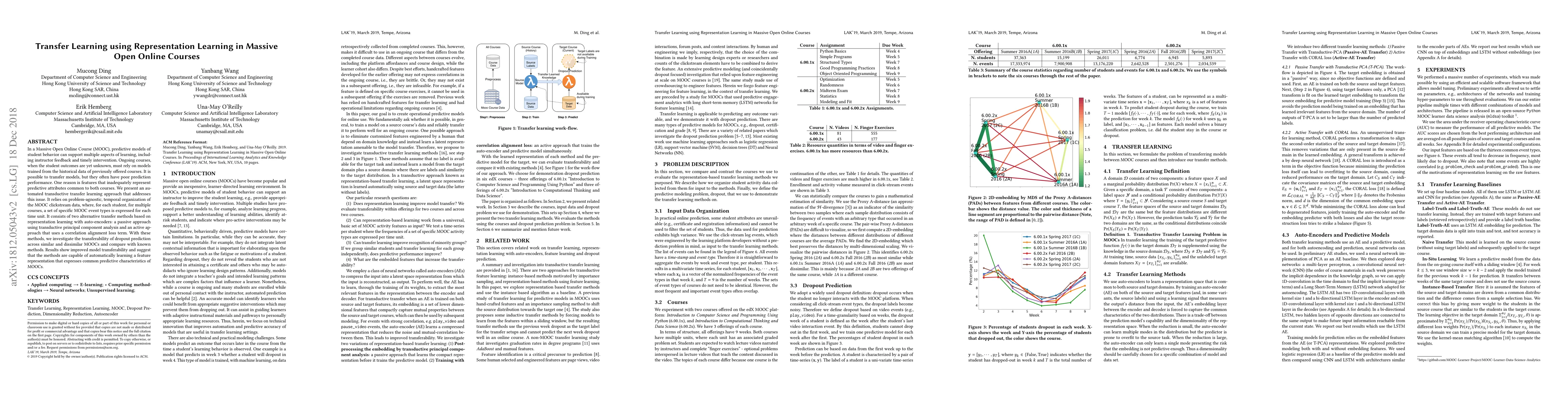 This paper presents an automated transfer learning approach using representation learning with auto-encoders to improve predictive models for student behavior in MOOC courses. The proposed methods enhance model transferability across similar and dissimilar MOOCs, demonstrating better performance than traditional methods.