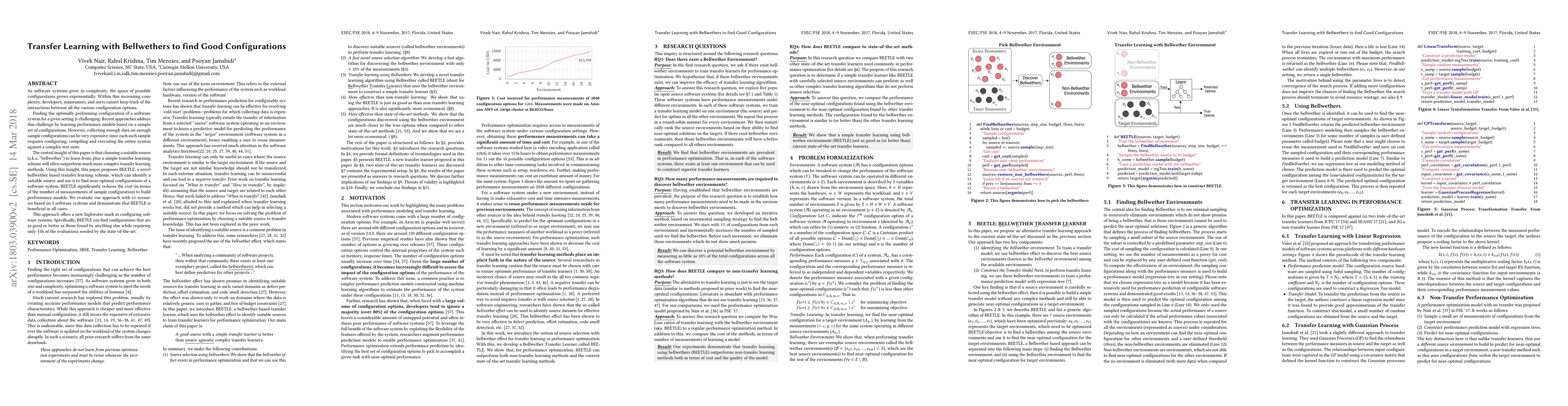 As software systems grow in complexity, the space of possible configurations grows exponentially. Within this increasing complexity, developers, maintainers, and users cannot keep track of the interactions between all the various configuration options. Finding the optimally performing configuration of a software system for a given setting is challenging. Recent approaches address this challenge by learning performance models based on a sample set of configurations. However, collecting enough data on enough sample configurations can be very expensive since each such sample requires configuring, compiling and executing the entire system against a complex test suite. The central insight of this paper is that choosing a suitable source (a.k.a. "bellwether") to learn from, plus a simple transfer learning scheme will often outperform much more complex transfer learning methods. Using this insight, this paper proposes BEETLE, a novel bellwether based transfer learning scheme, which can identify a suitable source and use it to find near-optimal configurations of a software system. BEETLE significantly reduces the cost (in terms of the number of measurements of sample configuration) to build performance models. We evaluate our approach with 61 scenarios based on 5 software systems and demonstrate that BEETLE is beneficial in all cases. This approach offers a new highwater mark in configuring software systems. Specifically, BEETLE can find configurations that are as good or better as those found by anything else while requiring only 1/7th of the evaluations needed by the state-of-the-art.