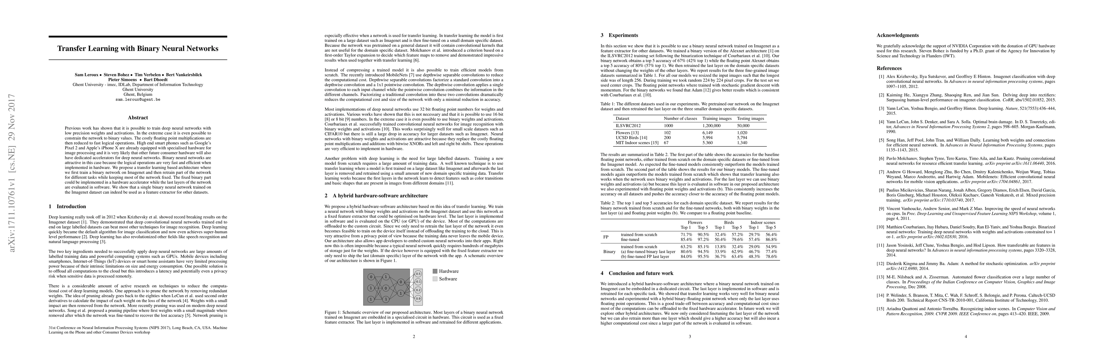 Previous work has shown that it is possible to train deep neural networks with low precision weights and activations. In the extreme case it is even possible to constrain the network to binary values. The costly floating point multiplications are then reduced to fast logical operations. High end smart phones such as Google's Pixel 2 and Apple's iPhone X are already equipped with specialised hardware for image processing and it is very likely that other future consumer hardware will also have dedicated accelerators for deep neural networks. Binary neural networks are attractive in this case because the logical operations are very fast and efficient when implemented in hardware. We propose a transfer learning based architecture where we first train a binary network on Imagenet and then retrain part of the network for different tasks while keeping most of the network fixed. The fixed binary part could be implemented in a hardware accelerator while the last layers of the network are evaluated in software. We show that a single binary neural network trained on the Imagenet dataset can indeed be used as a feature extractor for other datasets.