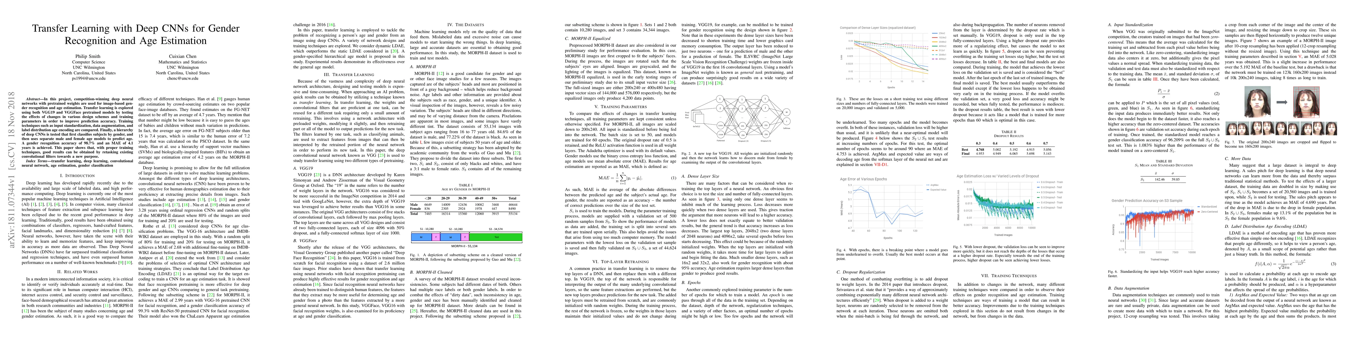 This paper explores transfer learning with deep CNNs for gender recognition and age estimation using pretrained VGG19 and VGGFace models, achieving 98.7% accuracy for gender and a 4.1-year MAE for age. Techniques like data augmentation and label distribution improve prediction accuracy.