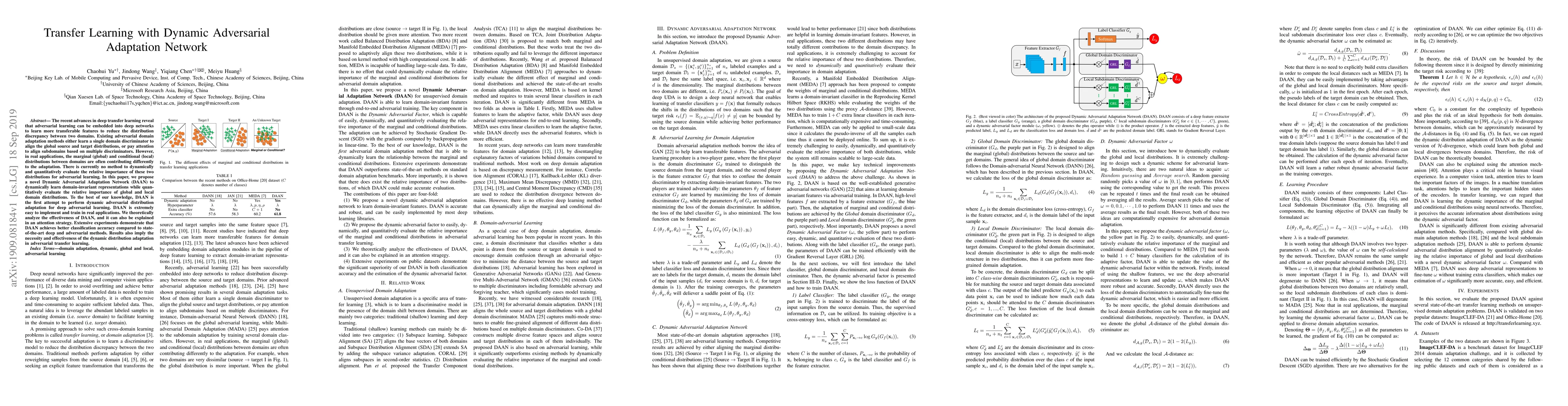 This paper proposes a Dynamic Adversarial Adaptation Network (DAAN) to dynamically learn domain-invariant representations and evaluate the relative importance of global and local domain distributions in adversarial transfer learning. DAAN achieves better classification accuracy compared to state-of-the-art methods, demonstrating the effectiveness of dynamic distribution adaptation.