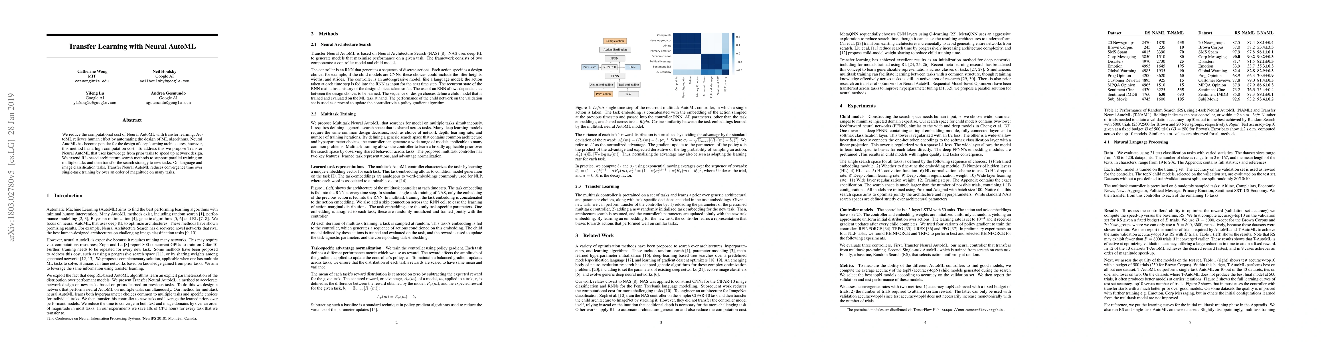 This paper proposes Transfer Neural AutoML to reduce computational costs in Neural AutoML, leveraging knowledge from prior tasks to accelerate deep learning architecture design. The method significantly reduces convergence time on language and image classification tasks compared to single-task training.