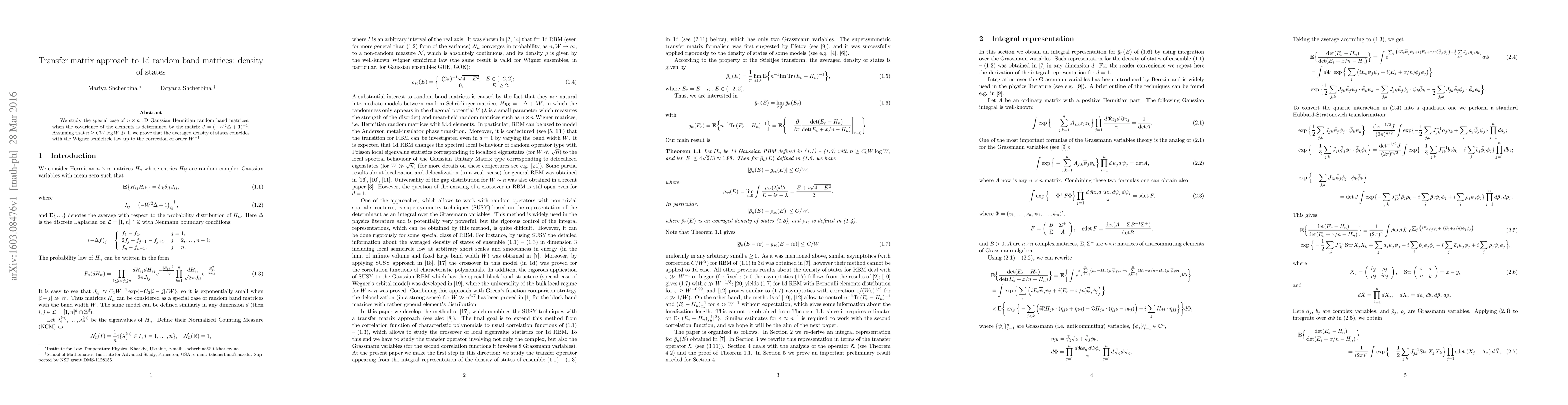 This paper explores the density of states for $n\times n$ 1D Gaussian Hermitian random band matrices with a specific covariance structure. It demonstrates that under certain conditions, the averaged density of states aligns with the Wigner semicircle law, with corrections of order $W^{-1}$.
