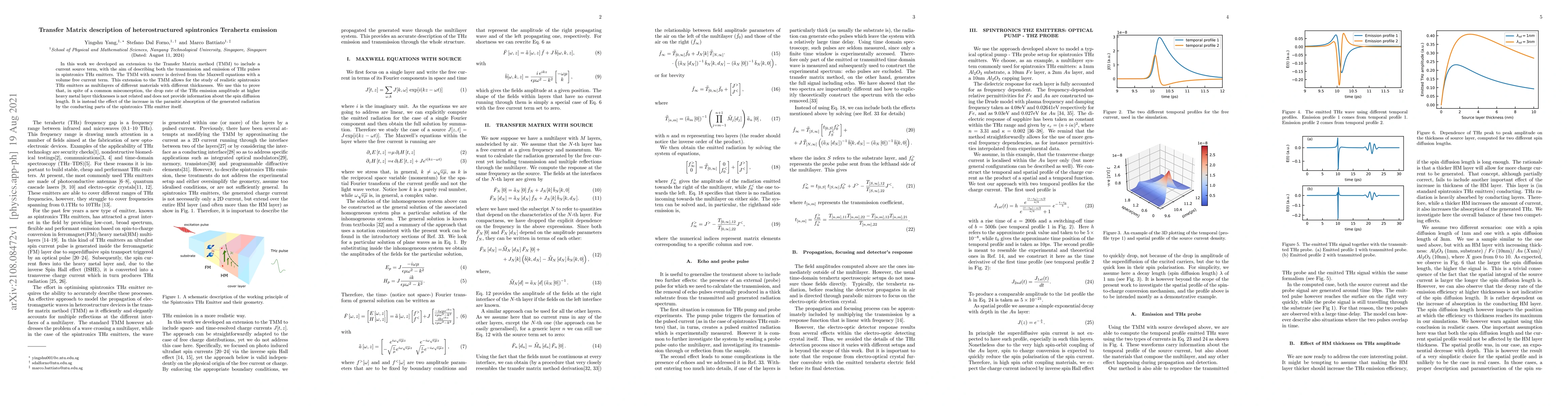 In this work we developed an extension to the Transfer Matrix method (TMM) to include a current source term, with the aim of describing both the transmission and emission of THz pulses in spintronics THz emitters. The TMM with source is derived from the Maxwell equations with a volume free current term. This extension to the TMM allows for the study of realistic spintronics THz emitters as multilayers of different materials with different thicknesses. We use this to prove that, in spite of a common misconception, the drop rate of the THz emission amplitude at higher heavy metal layer thicknesses is not related and does not provide information about the spin diffusion length. It is instead the effect of the increase in the parasitic absorption of the generated radiation by the conducting parts of the spintronics THz emitter itself.