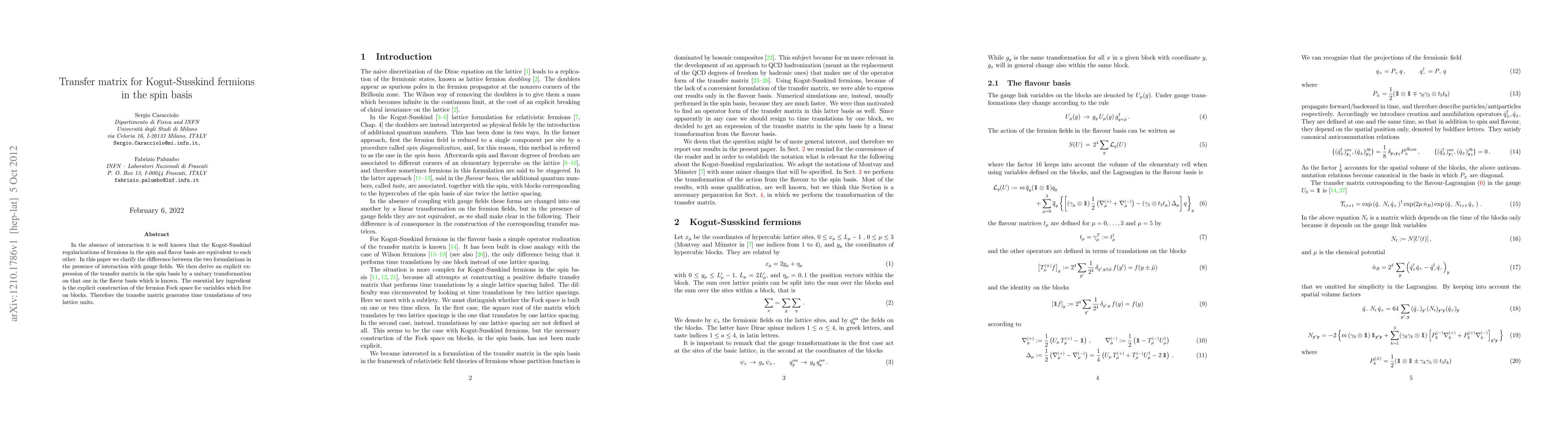 This paper clarifies the distinction between Kogut-Susskind fermion formulations in the spin and flavor basis when interacting with gauge fields. It derives an explicit transfer matrix in the spin basis via a unitary transformation from the known flavor basis matrix, emphasizing the construction of the fermion Fock space for lattice variables.