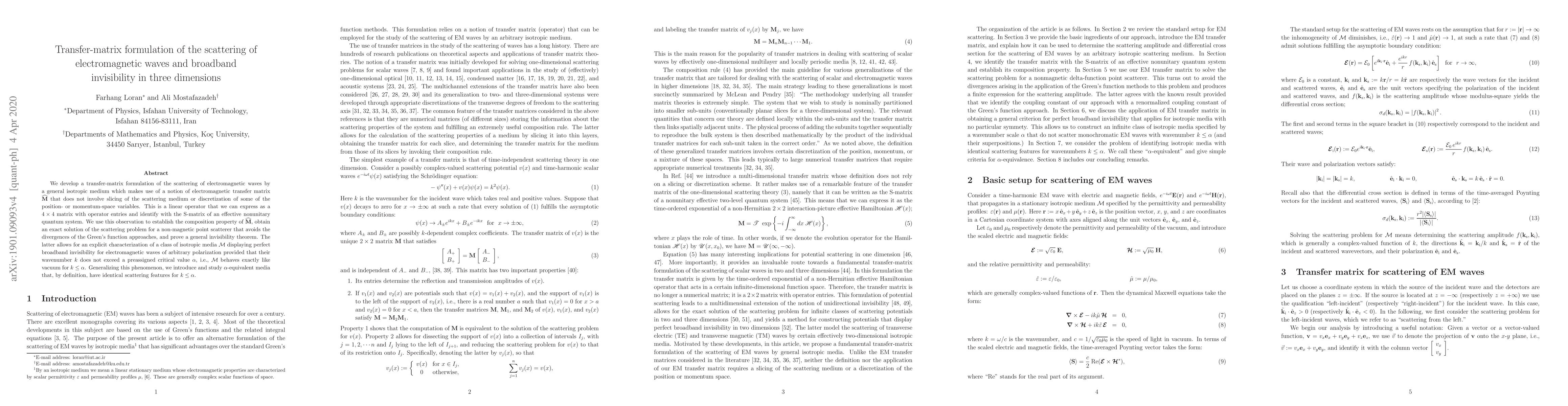We develop a transfer-matrix formulation of the scattering of electromagnetic waves by a general isotropic medium which makes use of a notion of electromagnetic transfer matrix $\mathbf{M}$ that does not involve slicing of the scattering medium or discretization of some of the position- or momentum-space variables. This is a linear operator that we can express as a $4\times 4$ matrix with operator entries and identify with the S-matrix of an effective nonunitary quantum system. We use this observation to establish the composition property of $\mathbf{M}$, obtain an exact solution of the scattering problem for a non-magnetic point scatterer that avoids the divergences of the Green's function approaches, and prove a general invisibility theorem. The latter allows for an explicit characterization of a class of isotropic media ${\cal M}$ displaying perfect broadband invisibility for electromagnetic waves of arbitrary polarization provided that their wavenumber $k$ does not exceed a preassigned critical value $\alpha$, i.e., ${\cal M}$ behaves exactly like vacuum for $k\leq\alpha$. Generalizing this phenomenon, we introduce and study $\alpha$-equivalent media that, by definition, have identical scattering features for $k\leq\alpha$.
