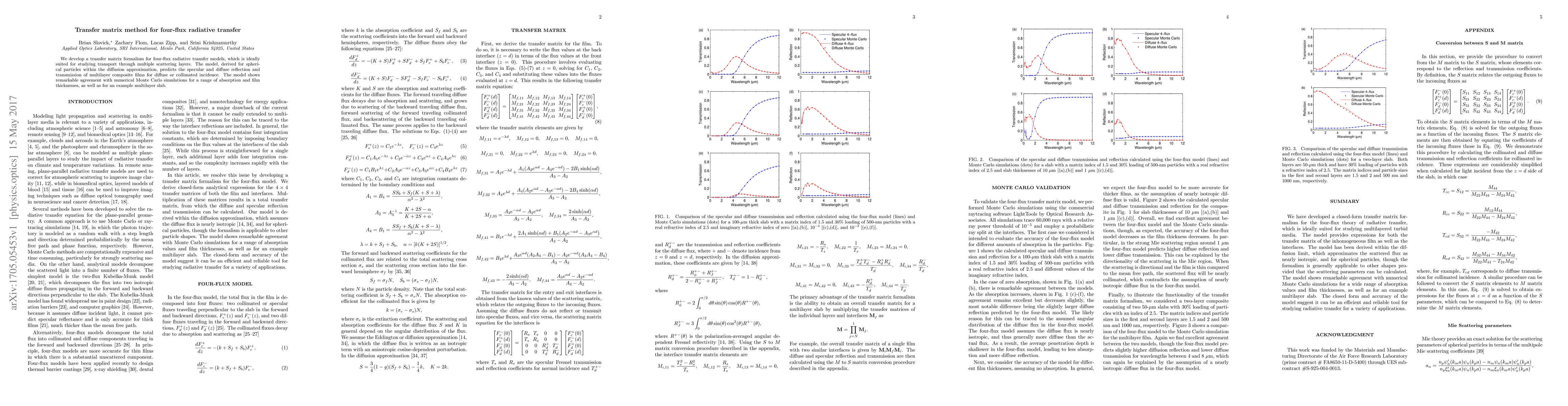 This research introduces a transfer matrix method for analyzing four-flux radiative transfer in multiple scattering layers, particularly for spherical particles. The model, validated against Monte Carlo simulations, accurately predicts reflection and transmission for various absorption levels and film thicknesses.