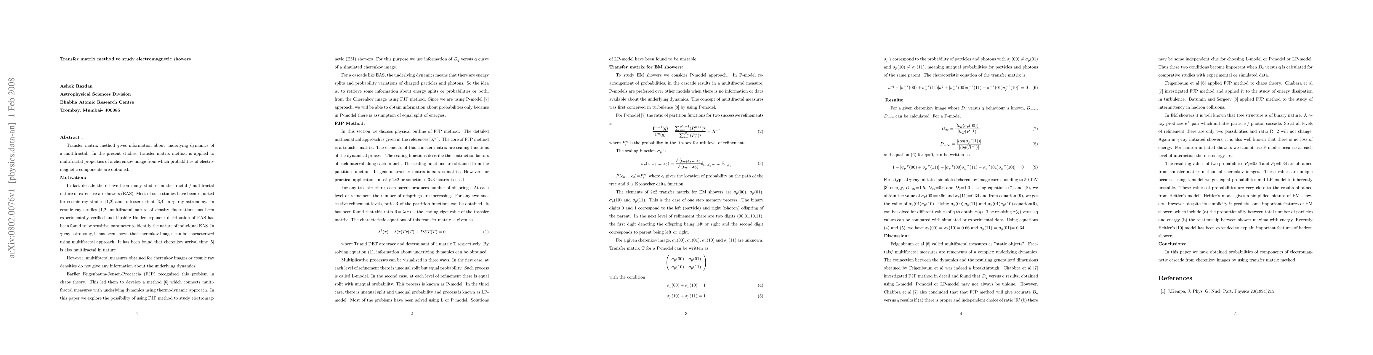 Summary: This paper uses the transfer matrix method to analyze the multifractal properties of Cherenkov images, deriving probabilities for electromagnetic shower components. The method elucidates the underlying dynamics of the electromagnetic shower.