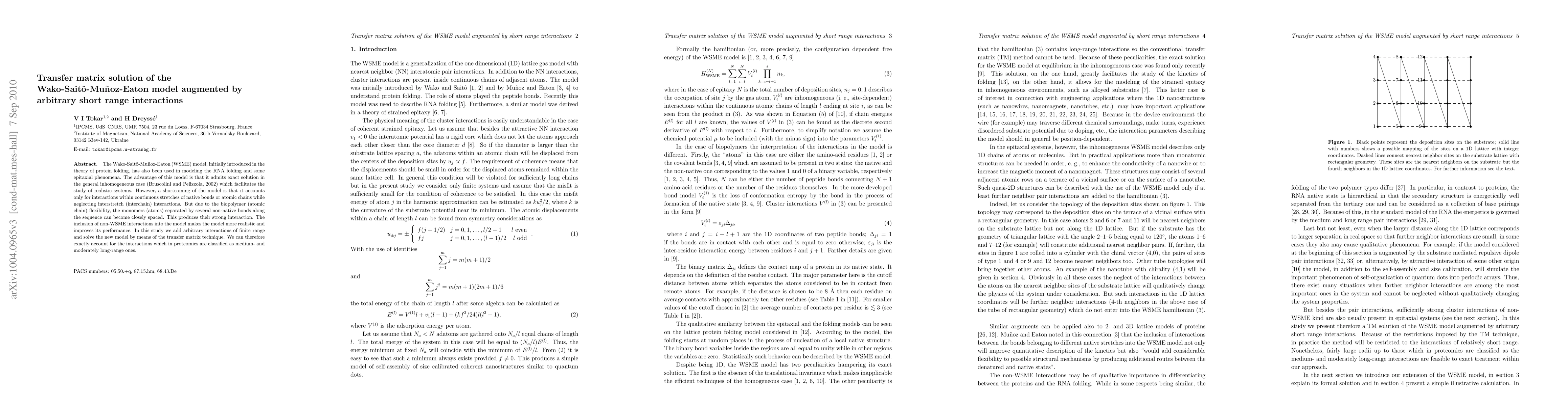 The Wako-Sait{\^o}-Mu\~noz-Eaton (WSME) model, initially introduced in the theory of protein folding, has also been used in modeling the RNA folding and some epitaxial phenomena. The advantage of this model is that it admits exact solution in the general inhomogeneous case (Bruscolini and Pelizzola, 2002) which facilitates the study of realistic systems. However, a shortcoming of the model is that it accounts only for interactions within continuous stretches of native bonds or atomic chains while neglecting interstretch (interchain) interactions. But due to the biopolymer (atomic chain) flexibility, the monomers (atoms) separated by several non-native bonds along the sequence can become closely spaced. This produces their strong interaction. The inclusion of non-WSME interactions into the model makes the model more realistic and improves its performance. In this study we add arbitrary interactions of finite range and solve the new model by means of the transfer matrix technique. We can therefore exactly account for the interactions which in proteomics are classified as medium- and moderately long-range ones.