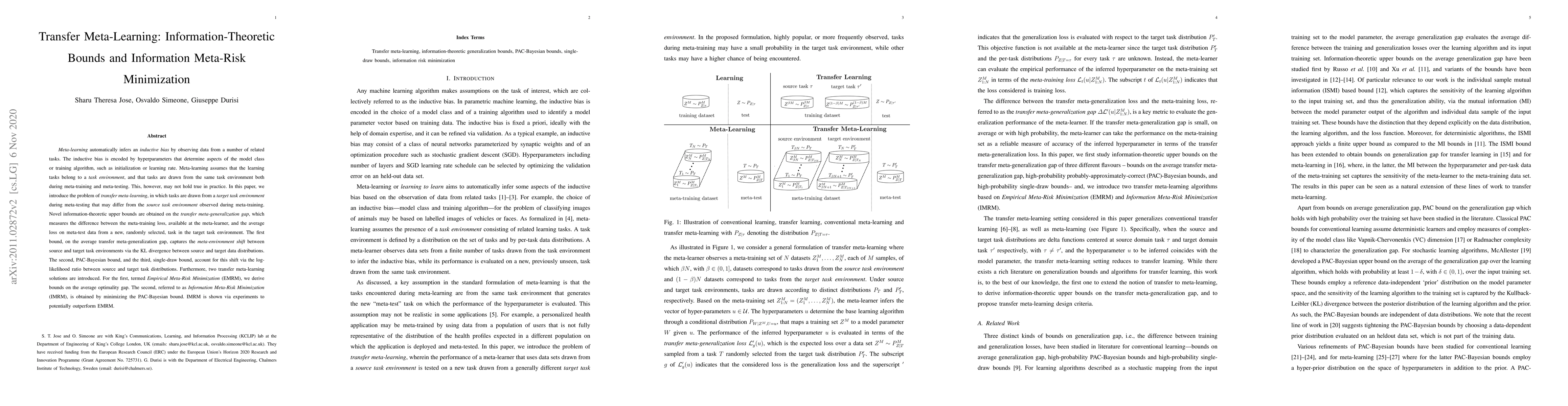 This paper explores transfer meta-learning, addressing the challenge when meta-test tasks differ from the meta-training environment. It introduces information-theoretic bounds to quantify the meta-generalization gap and proposes two solutions: Empirical Meta-Risk Minimization (EMRM) and Information Meta-Risk Minimization (IMRM), showing IMRM can outperform EMRM in practice.