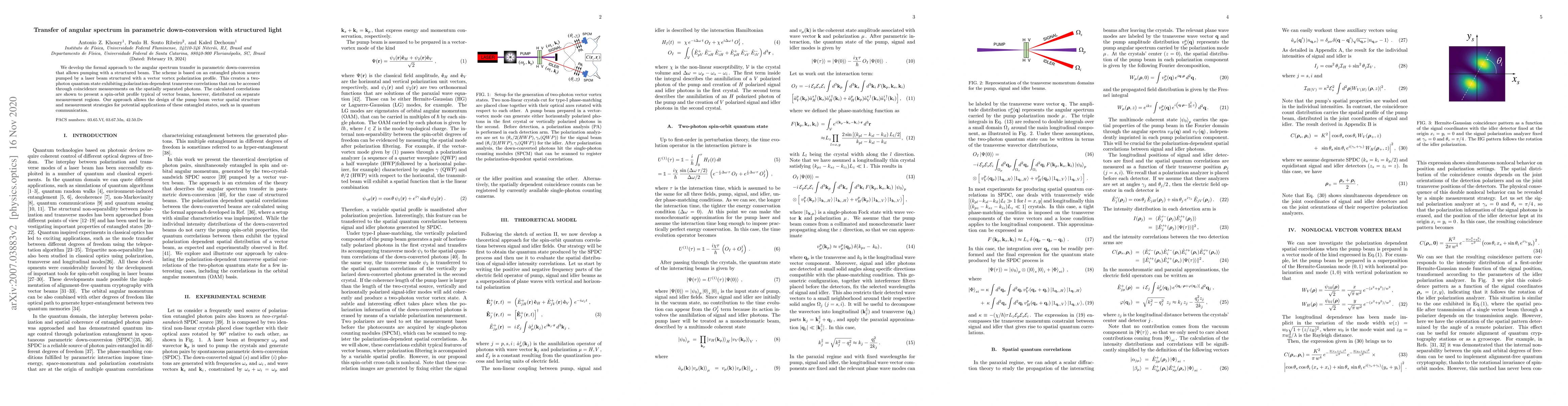 We develop the formal approach to the angular spectrum transfer in parametric down-conversion that allows pumping with a structured beam. The scheme is based on an entangled photon source pumped by a laser beam structured with a vector-vortex polarization profile. This creates a two-photon quantum state exhibiting polarization-dependent transverse correlations that can be accessed through coincidence measurements on the spatially separated photons. The calculated correlations are shown to present a spin-orbit profile typical of vector beams, however, distributed on separate measurement regions. Our approach allows the design of the pump beam vector spatial structure and measurement strategies for potential applications of these entangled states, such as in quantum communication.