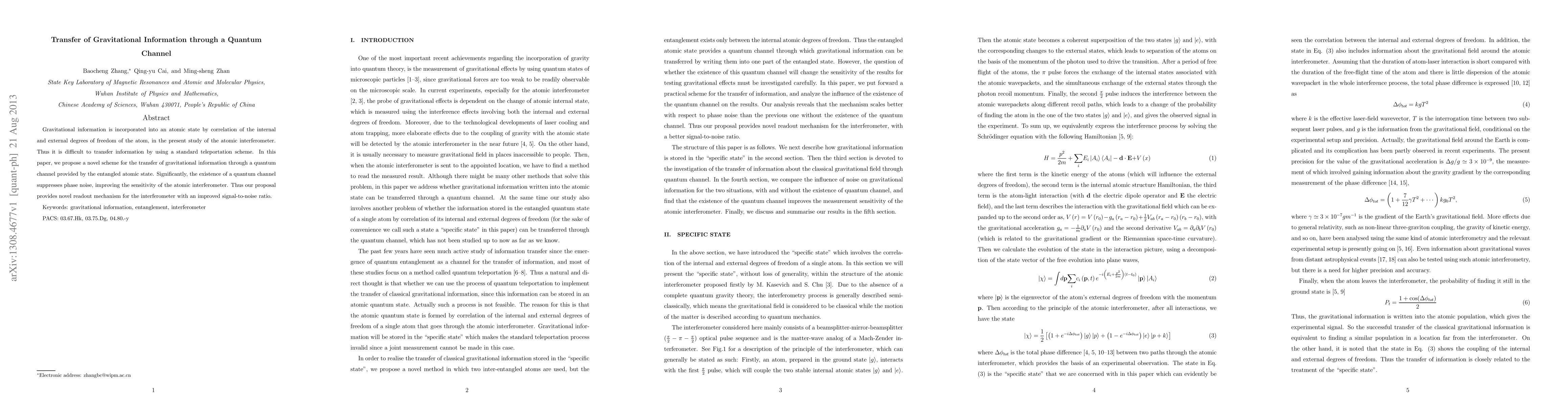 This paper proposes a novel scheme for transferring gravitational information via a quantum channel using entangled atomic states, which suppresses phase noise and enhances the sensitivity of atomic interferometers, offering a new mechanism for improved signal-to-noise ratio.