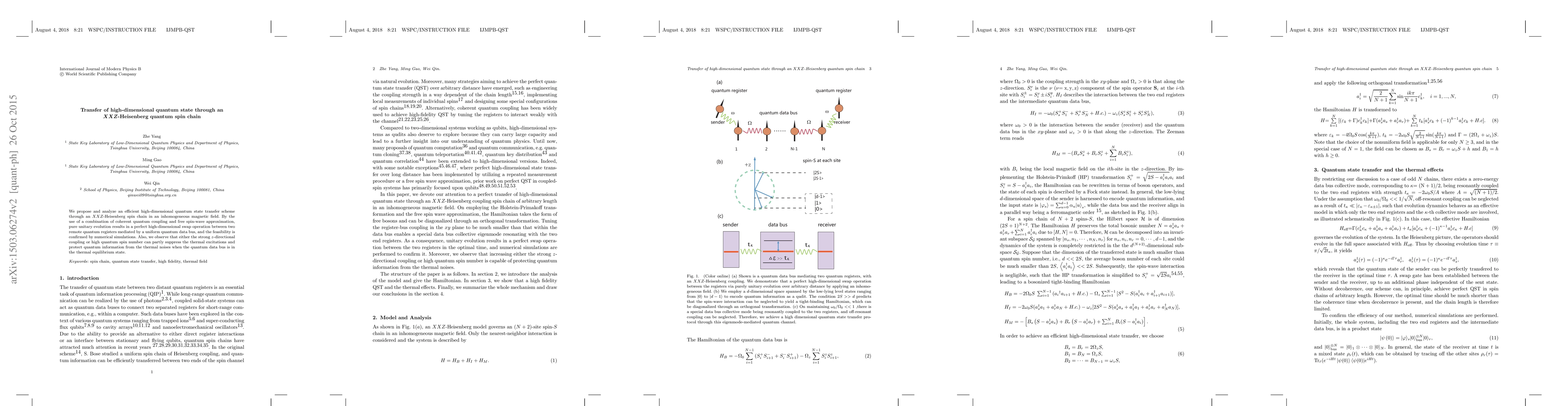 This paper proposes an efficient quantum state transfer scheme through an XXZ-Heisenberg spin chain using coherent quantum coupling and free spin-wave approximation, achieving perfect high-dimensional swap operations. Numerical simulations confirm feasibility and show that strong z-directional coupling or high quantum spin number can mitigate thermal excitations and protect quantum information.