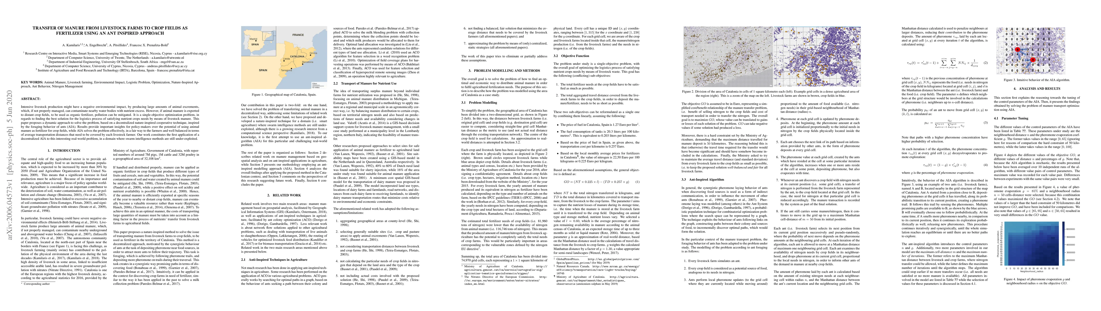Intensive livestock production might have a negative environmental impact, by producing large amounts of animal excrements, which, if not properly managed, can contaminate nearby water bodies with nutrient excess. However, if animal manure is exported to distant crop fields, to be used as organic fertilizer, pollution can be mitigated. It is a single-objective optimization problem, in regards to finding the best solution for the logistics process of satisfying nutrient crops needs by means of livestock manure. This paper proposes a dynamic approach to solve the problem, based on a decentralized nature-inspired cooperative technique, inspired by the foraging behavior of ants (AIA). Results provide important insights for policy-makers over the potential of using animal manure as fertilizer for crop fields, while AIA solves the problem effectively, in a fair way to the farmers and well balanced in terms of average transportation distances that need to be covered by each livestock farmer. Our work constitutes the first application of a decentralized AIA to this interesting real-world problem, in a domain where swarm intelligence methods are still under-exploited.