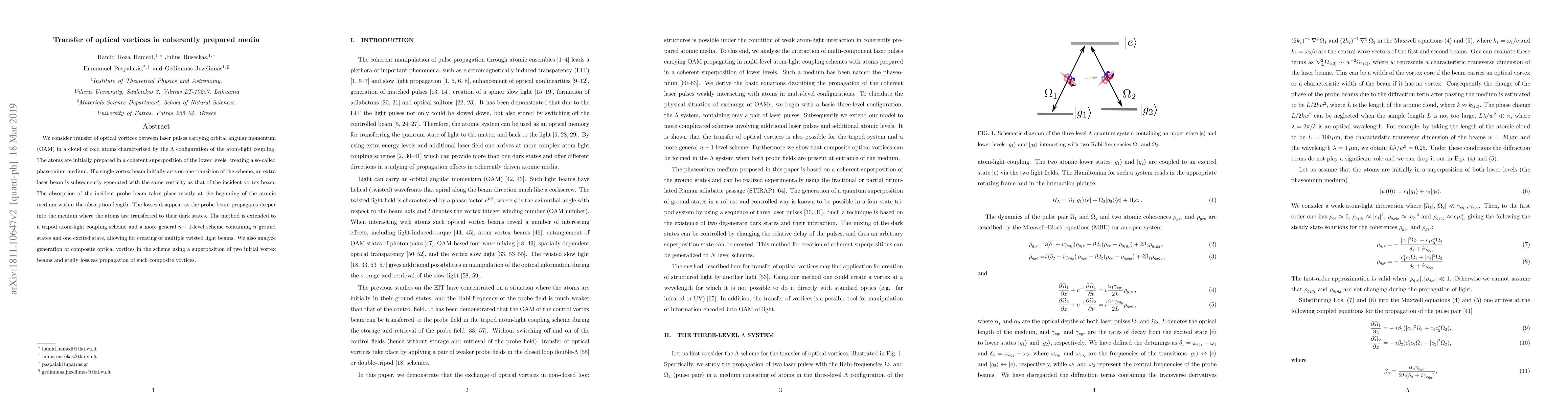 This paper explores the transfer of optical vortices between laser pulses in coherently prepared media, specifically in cold atoms with a $\Lambda$ configuration. It demonstrates the generation of an extra laser beam with the same vorticity as the incident vortex beam, and extends the method to more complex atom-light coupling schemes, allowing for the creation of multiple twisted light beams and the lossless propagation of composite optical vortices.