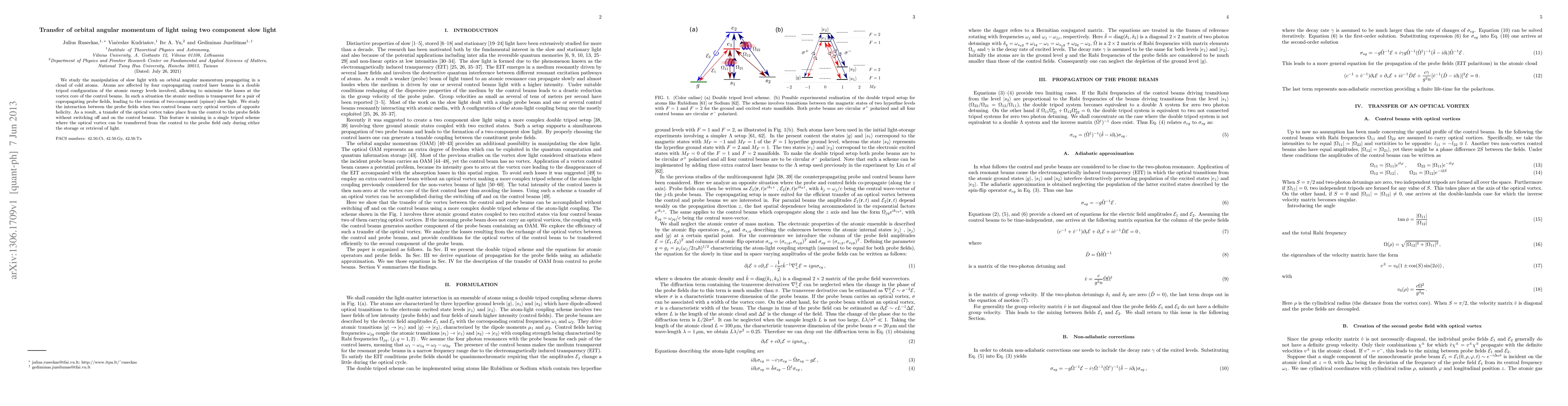 This paper investigates the transfer of orbital angular momentum from control beams to probe fields using slow light in a cloud of cold atoms, facilitated by a double tripod configuration. The study reveals that optical vortices can be transferred without interrupting the control beams, unlike in single tripod schemes.