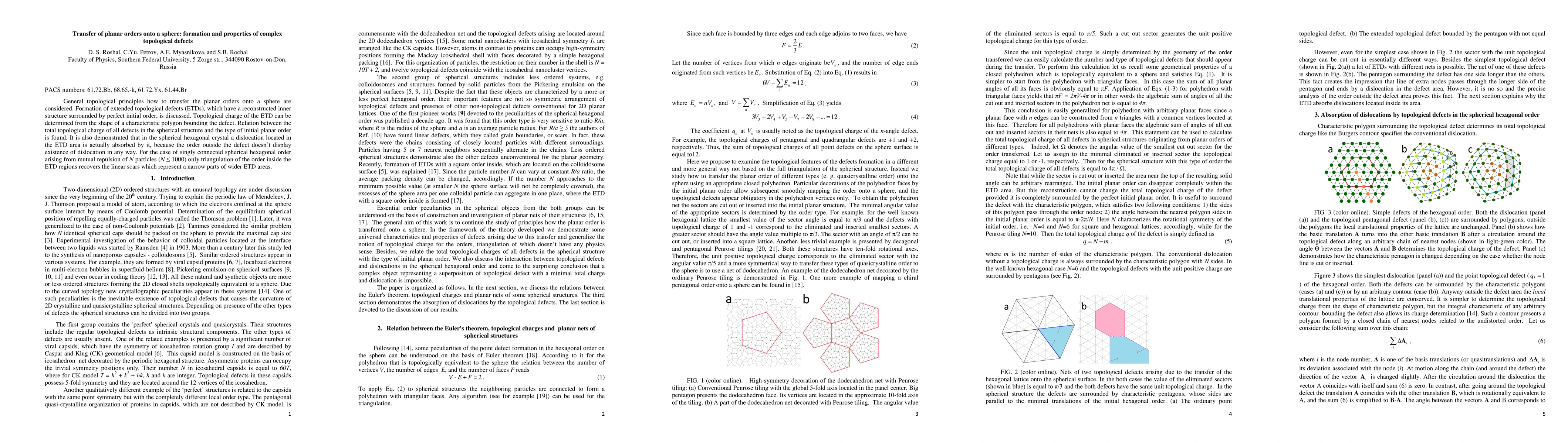General topological principles how to transfer the planar orders onto a sphere are considered. Formation of extended topological defects (ETDs), which have a reconstructed inner structure surrounded by perfect initial order, is discussed. Topological charge of the ETD can be determined from the shape of a characteristic polygon bounding the defect. Relation between the total topological charge of all defects in the spherical structure and the type of initial planar order is found. It is also demonstrated that in the spherical hexagonal crystal a dislocation located in the ETD area is actually absorbed by it, because the order outside the defect doesn't display existence of dislocation in any way. For the case of singly connected spherical hexagonal order arising from mutual repulsion of N particles (N < 1000) only triangulation of the order inside the ETD regions recovers the linear scars which represent a narrow parts of wider ETD areas.