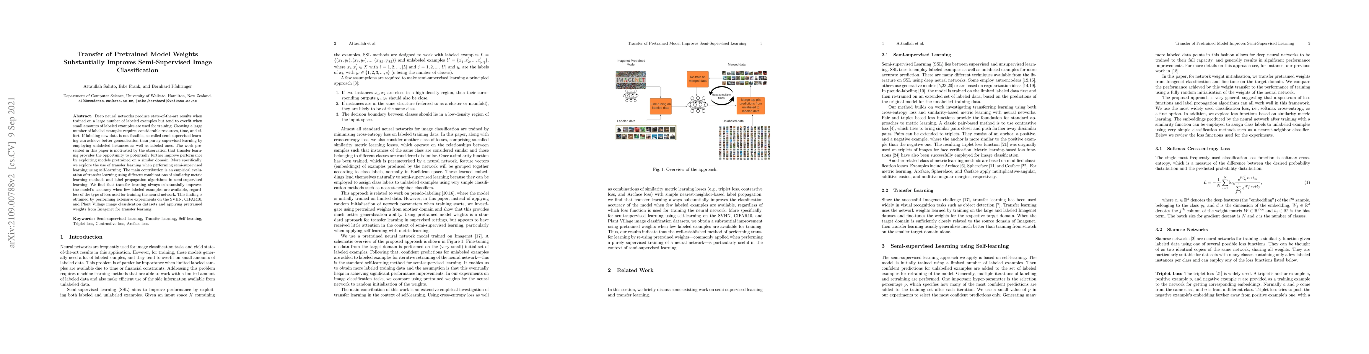 Deep neural networks produce state-of-the-art results when trained on a large number of labeled examples but tend to overfit when small amounts of labeled examples are used for training. Creating a large number of labeled examples requires considerable resources, time, and effort. If labeling new data is not feasible, so-called semi-supervised learning can achieve better generalisation than purely supervised learning by employing unlabeled instances as well as labeled ones. The work presented in this paper is motivated by the observation that transfer learning provides the opportunity to potentially further improve performance by exploiting models pretrained on a similar domain. More specifically, we explore the use of transfer learning when performing semi-supervised learning using self-learning. The main contribution is an empirical evaluation of transfer learning using different combinations of similarity metric learning methods and label propagation algorithms in semi-supervised learning. We find that transfer learning always substantially improves the model's accuracy when few labeled examples are available, regardless of the type of loss used for training the neural network. This finding is obtained by performing extensive experiments on the SVHN, CIFAR10, and Plant Village image classification datasets and applying pretrained weights from Imagenet for transfer learning.