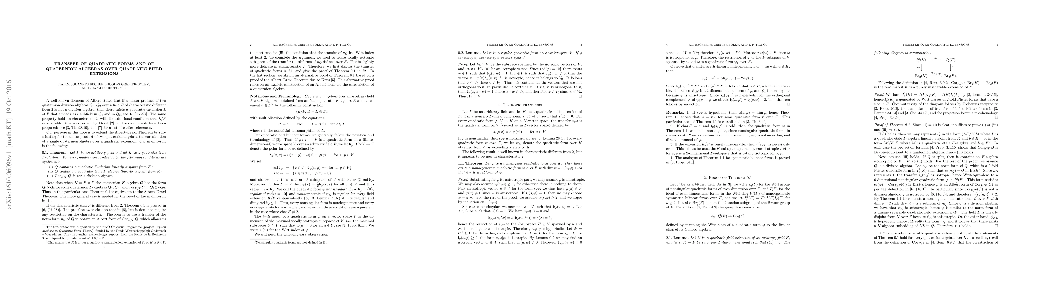 This paper proves a modified version of Albert-Draxl's theorem concerning the transfer of quaternion algebras over quadratic field extensions and establishes that a nonsingular quadratic form is isotropic if a certain linear functional vanishes on 1, implying the existence of a nondegenerate subform over the base field.