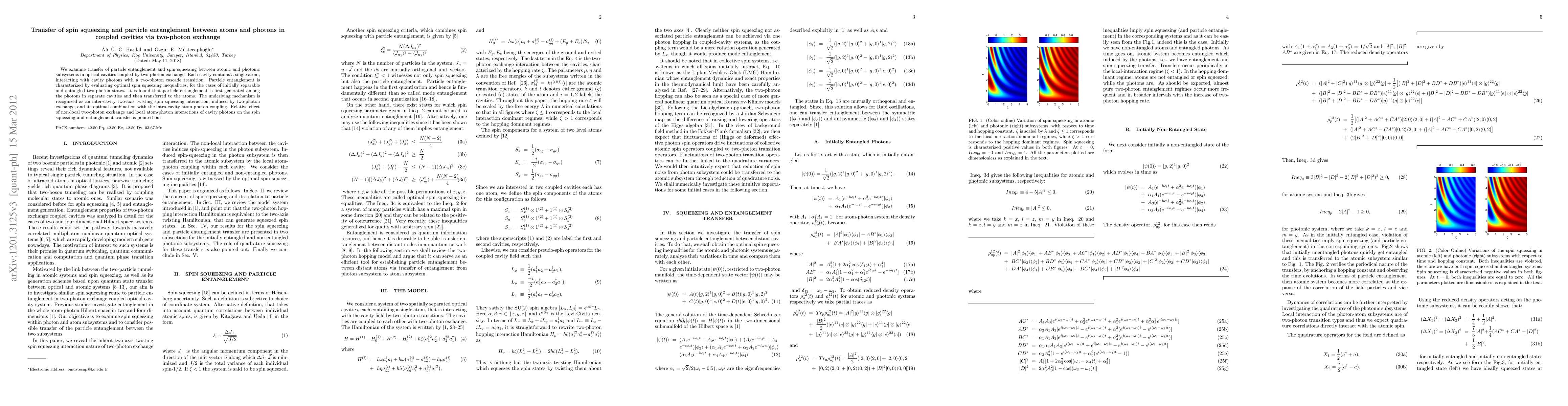 This paper investigates the transfer of particle entanglement and spin squeezing between atomic and photonic subsystems in coupled optical cavities via two-photon exchange. It finds that entanglement is first generated among photons and then transferred to atoms through an inter-cavity two-axis twisting spin squeezing interaction.