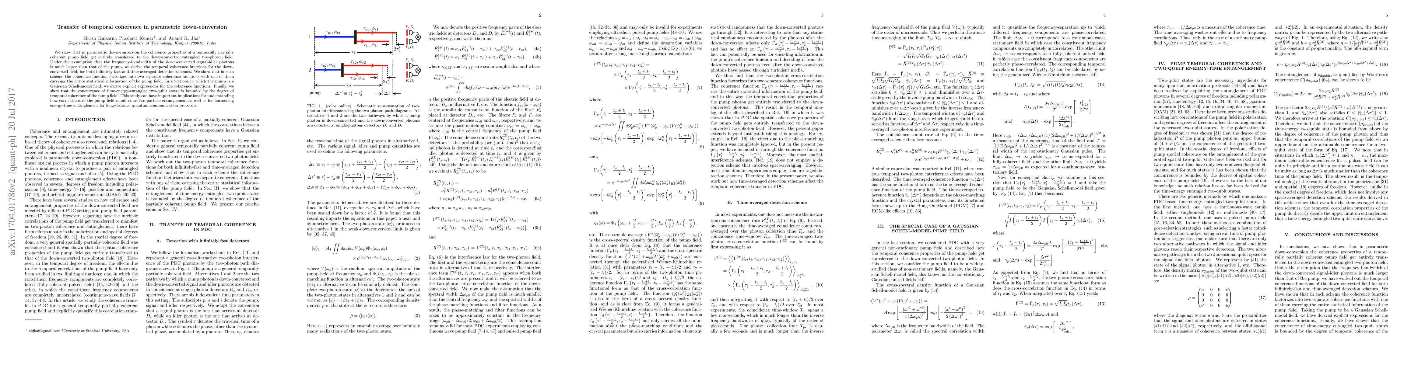 This paper demonstrates that the temporal coherence properties of a partially coherent pump field are fully transferred to the entangled two-photon field in parametric down-conversion. It derives coherence functions for the down-converted field, showing that the coherence function factorizes, carrying the statistical information of the pump field, and discusses implications for quantum communication protocols.