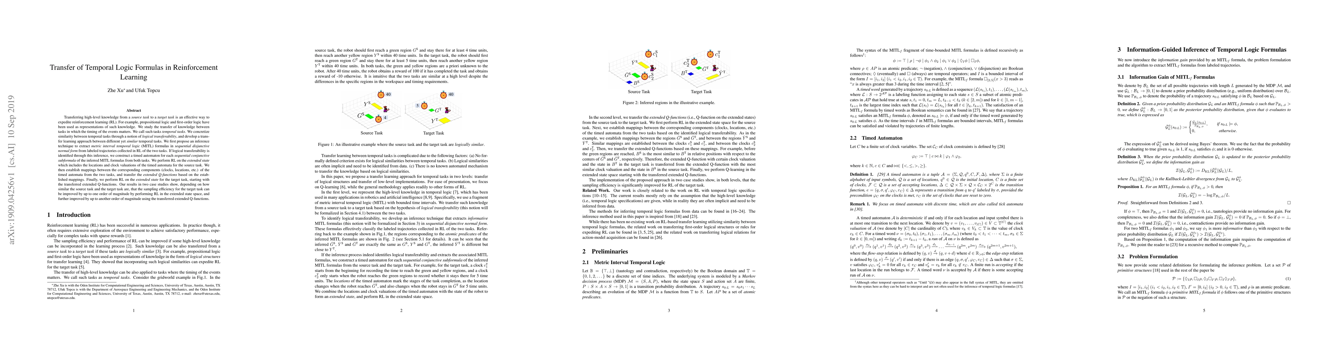 This paper explores transfer learning in reinforcement learning (RL) for temporal tasks, proposing a method to transfer high-level knowledge through metric interval temporal logic (MITL) formulas. The approach leverages timed automata and extended state spaces to improve sampling efficiency in RL, achieving up to two orders of magnitude improvement in similar tasks.